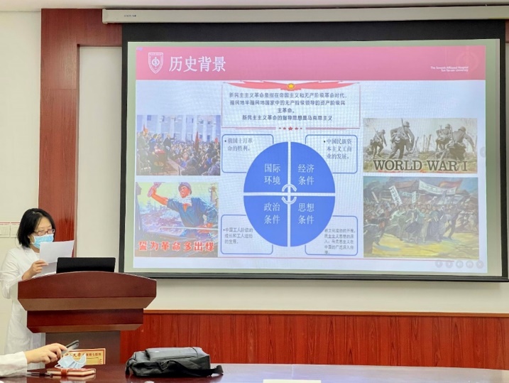 5月25日,第一学习小组的团员张晞向支部团员们分享了她学习新民主主义革命时期的成果体会,详细介绍了新民主主义革命的历史背景及其主要事件。