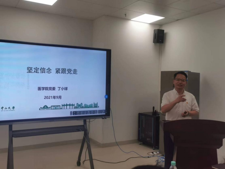 近日,科研教工党支部在医学院党员活动室组织召开“永远跟党走、奋进新征程”专题党课学习暨党员大会补选委员。中山大学医学院党委书记丁小球同志受邀参与此次党课授课,科研教工党支部书记邓宇斌教授主持党课学习及选举工作,支部共34位党员参加了此次活动。