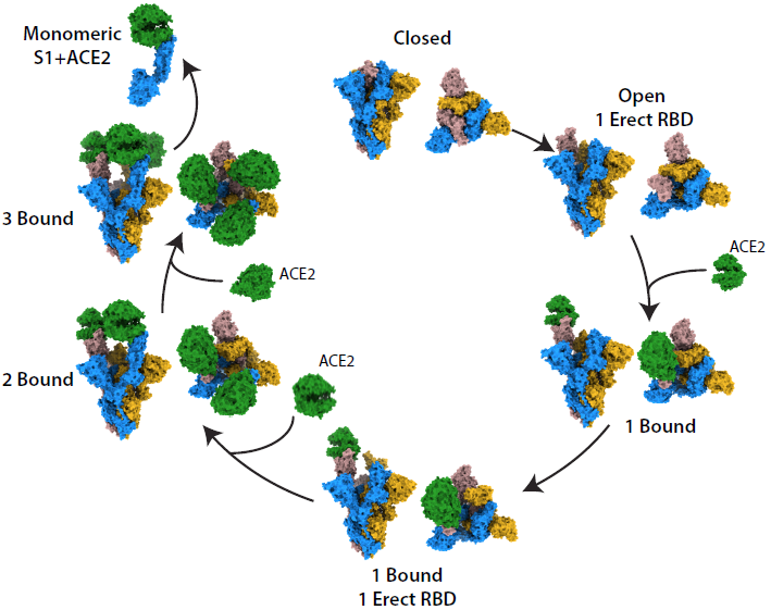 该研究通过冷冻电镜技术,解析了10个三维高分辨率结构,涵盖了在ACE2存在的情况下,从S蛋白完全关闭到完全打开,再到三聚体解离为单体的主要过程。为协助人们理解病毒在入侵时S蛋白构象发生变化,导致融膜区域暴露,进而促进病毒融膜的过程提供了理论基础。
