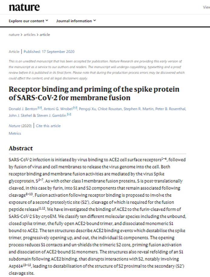 新冠肺炎疫情自暴发以来已持续半年有余,全球确诊感染人数已近三千万,死亡人数超九十万,尽管全球范围针对新冠病毒的基础研究投入巨大,但对新冠病毒入侵细胞的详细分子机制尚未能完全被解读。近日,我院科研中心张影副研究员课题组成员徐朋奇助理研究员继前期参与解析蝙蝠冠状病毒刺突蛋白结构后,再次与英国弗朗西斯·克里克研究所的科研人员合作,解析了一系列新冠病毒刺突蛋白与其结合受体ACE2复合物的三维结构,第一次在分子层面展示了病毒入侵宿主细胞过程中,病毒表面的抗原蛋白(S蛋白)与人体细胞表面受体结合以及产生构型变化的全过程。鉴于这些结构的新颖性和重要性,该研究成果发表在世界顶级期刊Nature上,为我院在全球抗疫的科研大画卷中增添了浓墨重彩的一笔。