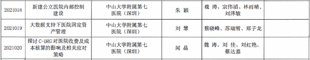 近日,深圳市会计学会公布了2021年度会计学术课题研究立项结果,中山七院财务团队申报的《新建公立医院内部控制建设》、《大数据支持下医院固定资产管理》、《探讨C-DRG对医院收费及成本核算的影响及相关应对策略》等三项课题获得立项,这是中山七院开业以来,财务团队首次获得会计学术类课题立项。