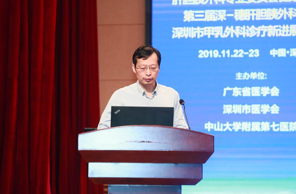 本次大会是中山七院普通外科承办的第三届年度大型学术会议,由我院院长何裕隆教授以及王深明教授、梁力建教授、王捷教授、彭宝岗教授、周杰教授担任大会主席,中山七院普通外科汤地主任、雷科锋副主任医师以及中山一院乳腺外科林颖教授担任执行主席。中山七院副院长张常华教授、潘逸航副院长,深圳市医学会肝胆外科专业委员会余小舫主委,深圳市医学会外科专业委员会鮑世韵主委,光明区卫健局罗龙基副局长,光明区医学会胡建辉秘书长等出席了大会开幕式。上海交通大学附属新华医院汤朝晖教授,安徽省立医院移植外科主任、前欧洲和德国肝移植协会主席Bjoern Nashan教授,中山大学附属孙逸仙纪念医院王捷教授、闵军教授,同济大学附属东方医院杨玉龙教授,广州医学院第二附属医院薛平教授,广东省中医院何军明教授,山东省立第三医院张锎教授,中山大学附属第一医院李家平教授、何强教授,北京清华长庚医院项灿宏教授,上海东方肝胆医院杨田教授,湖南省人民医院成伟教授,中山大学附属第三医院刘仁斌教授,中山一院林颖教授、彭振维教授,广东省人民医院阴英教授,深圳市人民医院余小舫教授、鲍世韵教授,深圳大学总医院巩鹏副院长、李晓武教授,中山五院张永裕教授,中山七院超声科徐作峰主任、内分泌科李芳萍主任等70余位专家出席会议并做了精彩的学术演讲,省内外医学同行200余人参加会议。