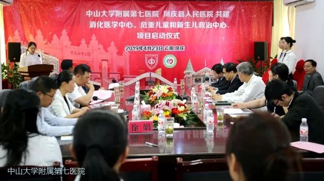 当日下午,凤庆县人民医院和中山大学附属第七医院共建的消化医学中心、危重儿童和新生儿救治中心正式揭牌。中山大学党委书记陈春声、工会常务副主席吴京洪,凤庆县人民政府县长杨红俊、县委副书记白玲、副县长杨文霞、副县长字学强、卫健局局长李家文,中山七院院长何裕隆、副院长张常华,凤庆人民医院院长徐娟等出席揭牌仪式。