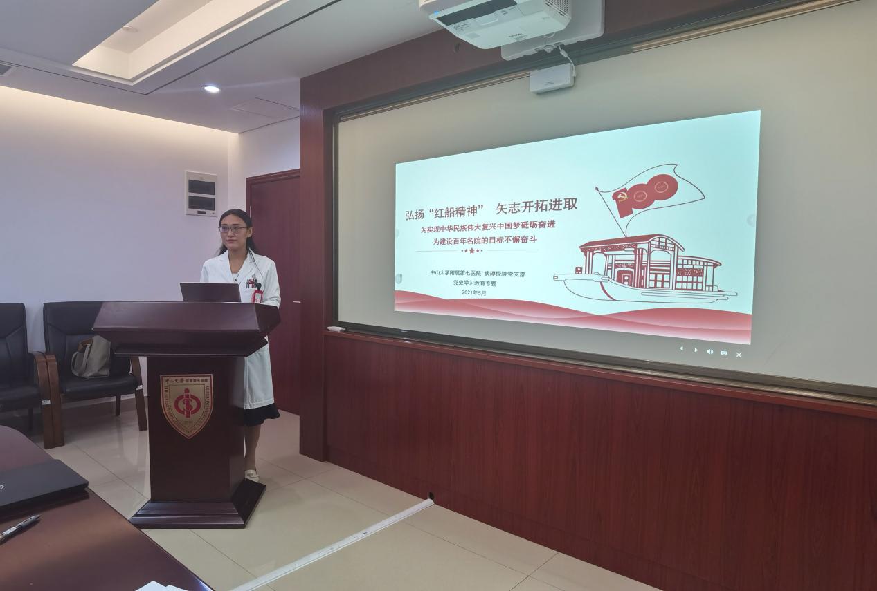 朱俊峰在发言中说:历史是最好的教科书,党史学习是我们的必修课。正值建党100周年之际,病理检验党支部全体成员一起重温我们党的历史,深刻学习领悟中国革命精神之源红船精神,让红船精神激励我们新时代的党员在建设中国特色社会主义新时代的道路上奋勇前进。中国共产党领航百年带领我们驶向一次又一次的辉煌。红船精神就是开天辟地、敢为人先的创新精神;坚定理想、百折不挠的奋斗精神;立党为公、忠诚为民的奉献精神。