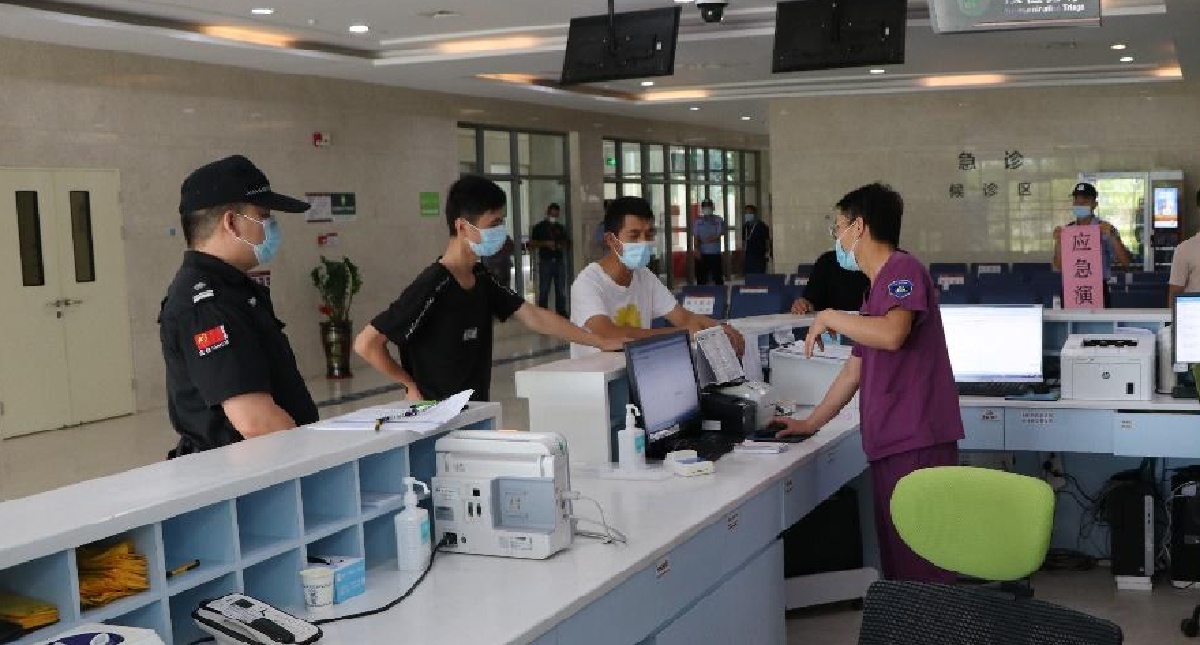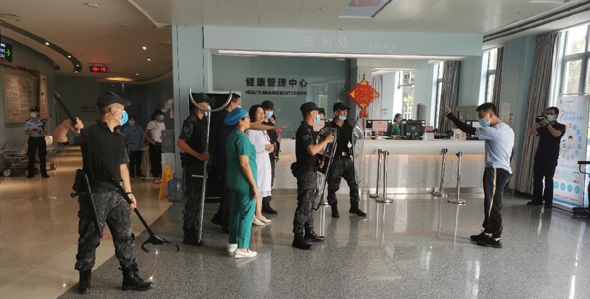 近年来,涉医暴力事件时有发生。为了提高医护人员及安保队伍的安全防范意识,做好医疗纠纷、涉医暴力事件的应急处置工作,稳固我院与新湖派出所的紧急联动机制,7月10日下午,后勤处保卫科与质评处医患关系科联合新湖派出所,在我院急诊与灾难医学中心、健康体检中心组织开展涉医事件应急演练,新湖派出所的30余名警力、院内的15名安保人员等参与了演练。