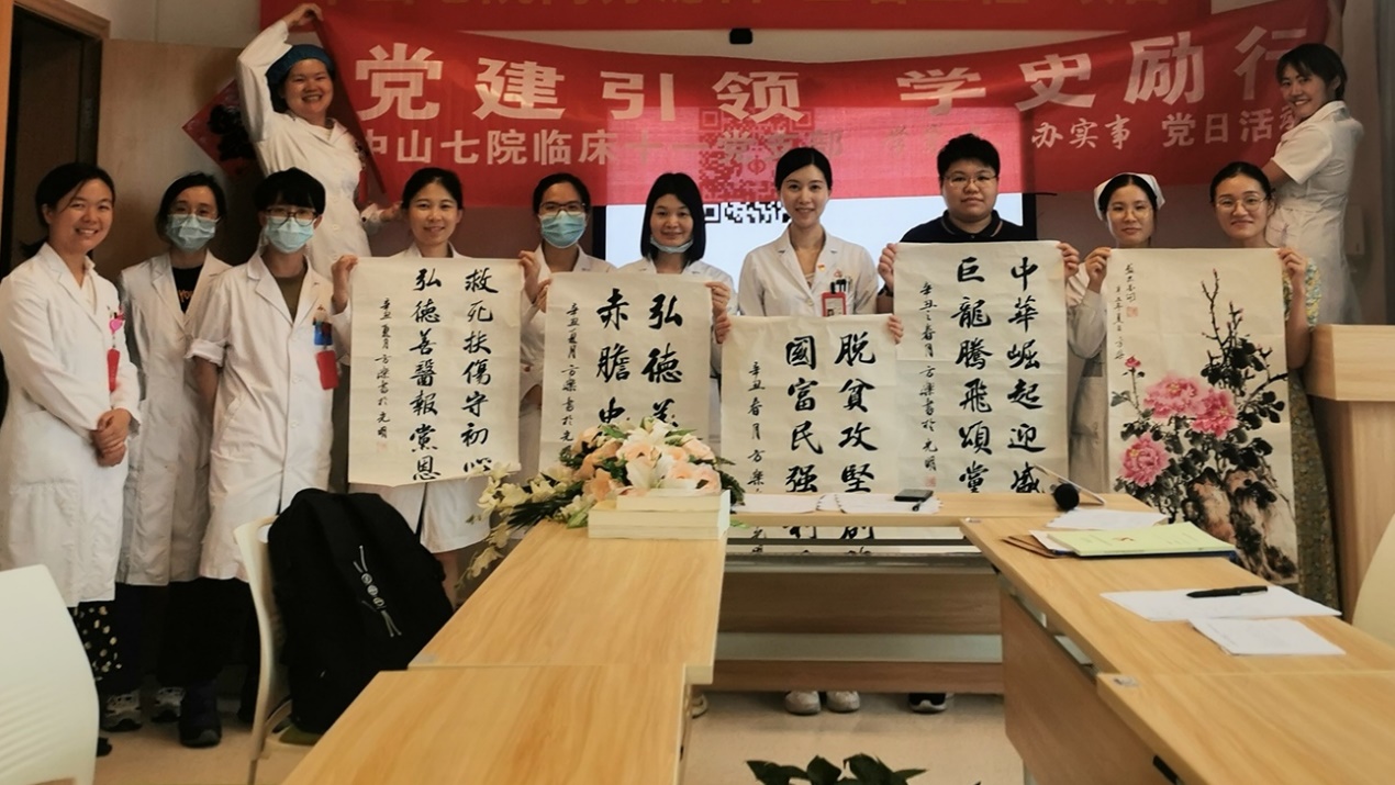 为庆祝中国共产党成立100周年,响应党中央在全国开展党史学习教育的号召。近日,中山七院临床十一党支部开展“党建引领,学史力行”主题系列活动二——书画颂党恩。活动由临床十一党支部书记方烁同志主持,临床十一支部全体党员参加,通过红色经典美术作品助力党史学习。
