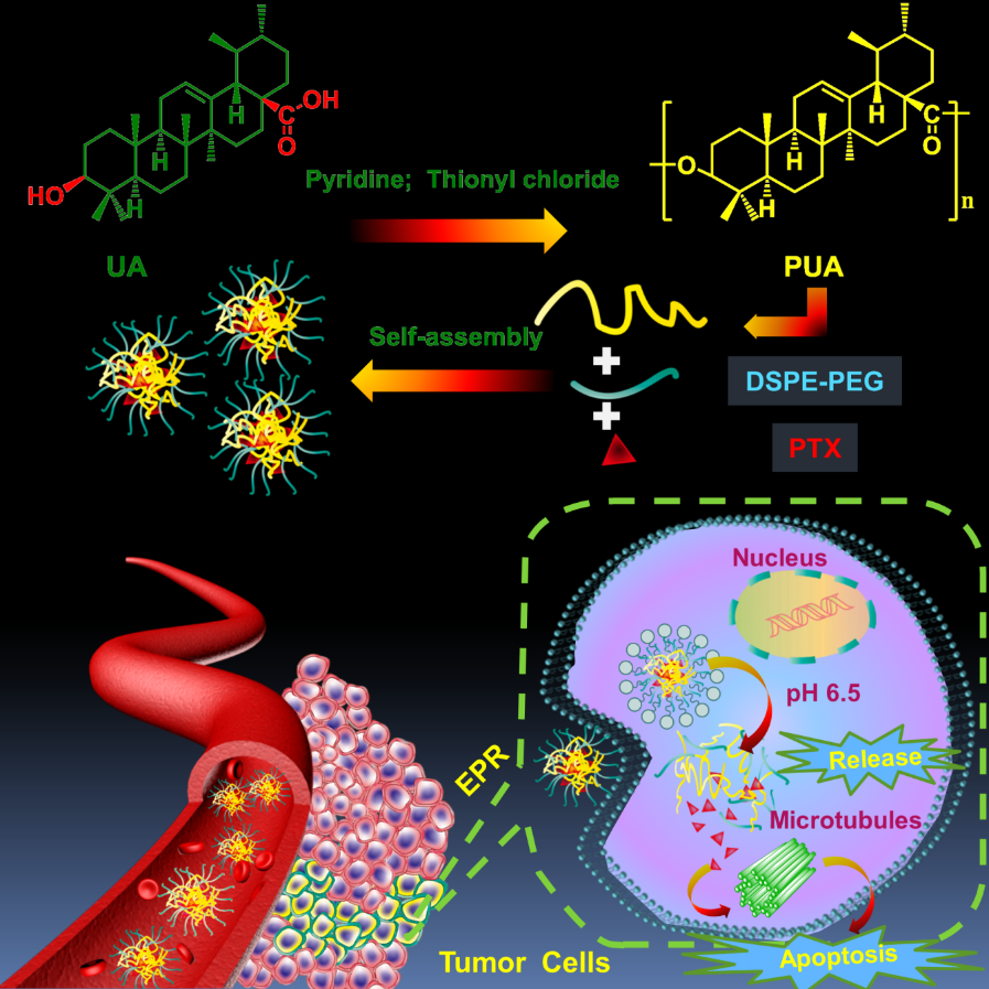 熊果酸(ursolic acid, UA)是一种广泛分布于中草药中的活性成分,具有镇静、抗炎、抗氧化、抗癌,肝保护等多种生物学效应。在本研究中,针对临床上治疗结直肠癌的化疗药物靶向性差等问题,通过合理的分子设计,康洋副研究员与血液内科团队创新性地选用熊果酸合成具有抗肿瘤活性的生物可降解高分子聚合物——聚熊果酸(poly-ursolic acid, PUA),并将其自组装成纳米粒作为抗癌药物递送平台(PUA-NPs)。所制备的载药纳米递药系统(PUA-NPs@PTX)具有合适的粒径大小以及较高的载药量,体内外结果显示PUA-NPs@PTX具有明显的抑制结直肠癌作用,同时,空白PUA-NPs也具有抑制肿瘤生长的作用,表明PUA本身具有抗癌活性。这种新型的聚合物纳米载体为新型活性生物材料的开发提供了新思路,也为临床结直肠癌及其他癌症治疗提供了一个有希望的方法,具有良好的临床转化前景。