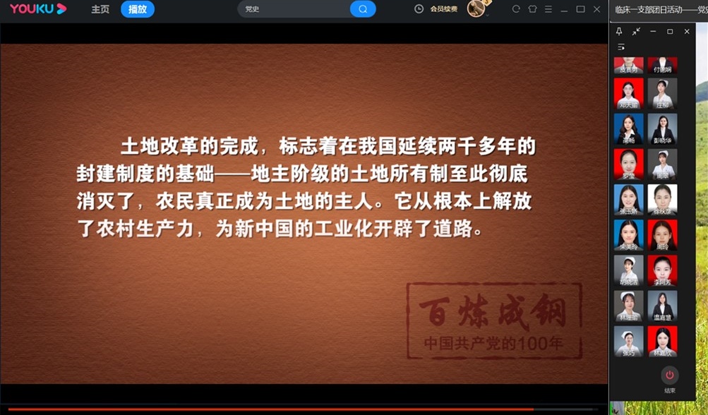 近日,中山七院临床一团支部组织团员进行线上党史学习,观看了中国共产党成立100周年系列影片——《社会主义革命与建设》。此次学习活动共有22名支部团员参加,重点学习了关于新中国的土地改革、宪法初步建立等内容,促进了团员们对于社会主义革命及建设时期中国共产党在政治、经济等多方面的伟大举措,让团员们对中国共产党的历史进程有了更深入的了解。