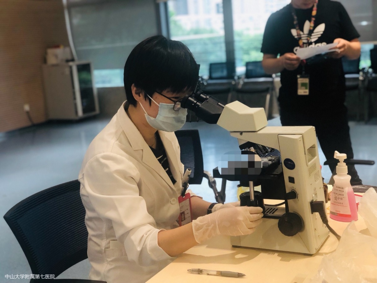 医务人员在显微镜下观察睫毛根部蠕形螨