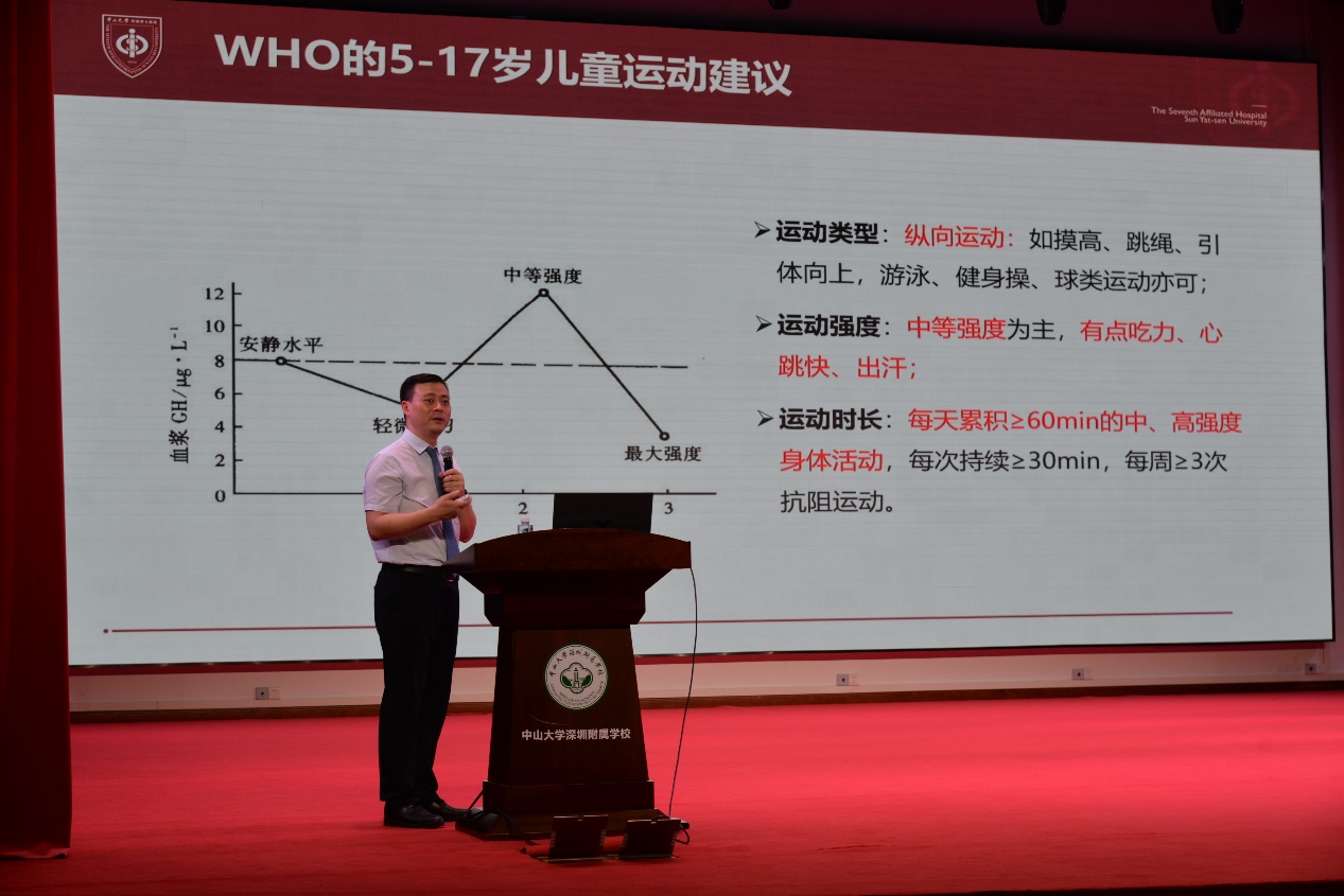 中山大学附属第七医院(以下简称“中山七院”)和中山大学附属学校(以下简称“附属学校”)有一个温暖的约定——“医教携手-共筑健康生活”医学科普进校园活动,在经历2022年的疫情反复后,由中山七院神经医学中心党支部发起、医院党委鼎力支持、医院众多党支部联合开展的中山七院医学科普进校园活动继续“倔强”前行。由于疫情防控的需要,2022年的前4期都只能采取线上的方式进行。6月6日,附属学校重启了在该校千人大讲堂的线下科普教育的模式,该校300名师生参加了现场科普活动。这期给孩子们送去的健康教育是由中山七院内分泌科的专家云鹏副主任医师(以下简称“云医生”)主讲的《长高的杏林秘籍》。中山七院和附属学校的领导对本次校园医学科普重启线下模式高度重视,医院党委陈起坤书记和附属学校罗灿校长、熊飞副校长亲临现场。