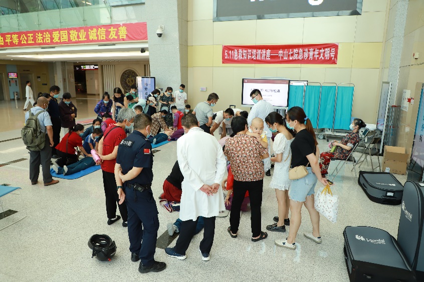 5月11日下午,适逢中山七院开业三周年庆,急诊与灾难医学中心青年文明号在医院门诊大厅举办了“5.11急救知识培训讲座”。活动向前来就诊的市民群众科普权威急救知识,短短2小时内陆续吸引了近120人互动参与,有效提高了市民群众急救素养水平。