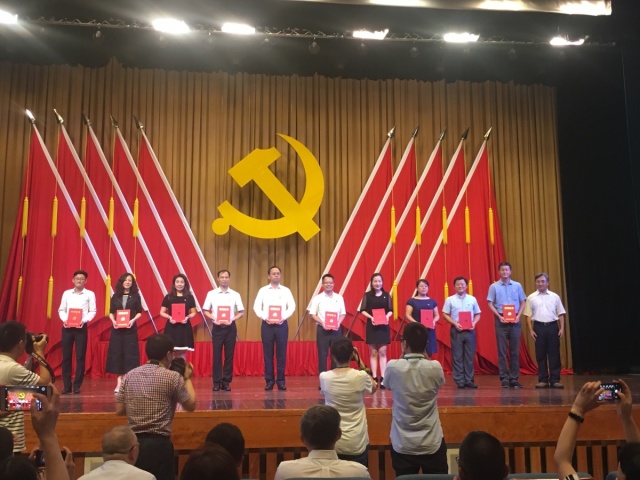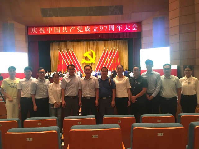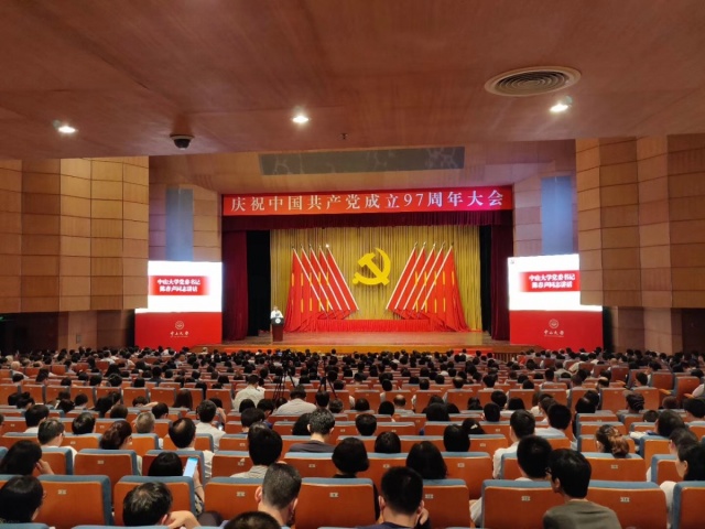 7月1日下午,学校在广州校区南校园梁銶琚堂隆重召开庆祝中国共产党成立97周年大会。广东省委教育工委组织处领导、学校党政领导,党群机关部门、直属单位领导,二级党组织领导,老党员代表,优秀共产党员、优秀党务工作者、先进基层党组织表彰对象,师生和民主党派代表1300多人参加会议,学校党委副书记、校长罗俊主持会议。中山七院党委副书记、纪委书记陈起坤同志、临床二支部书记庞俊同志以及党员、入党积极分子代表10余人现场参会。