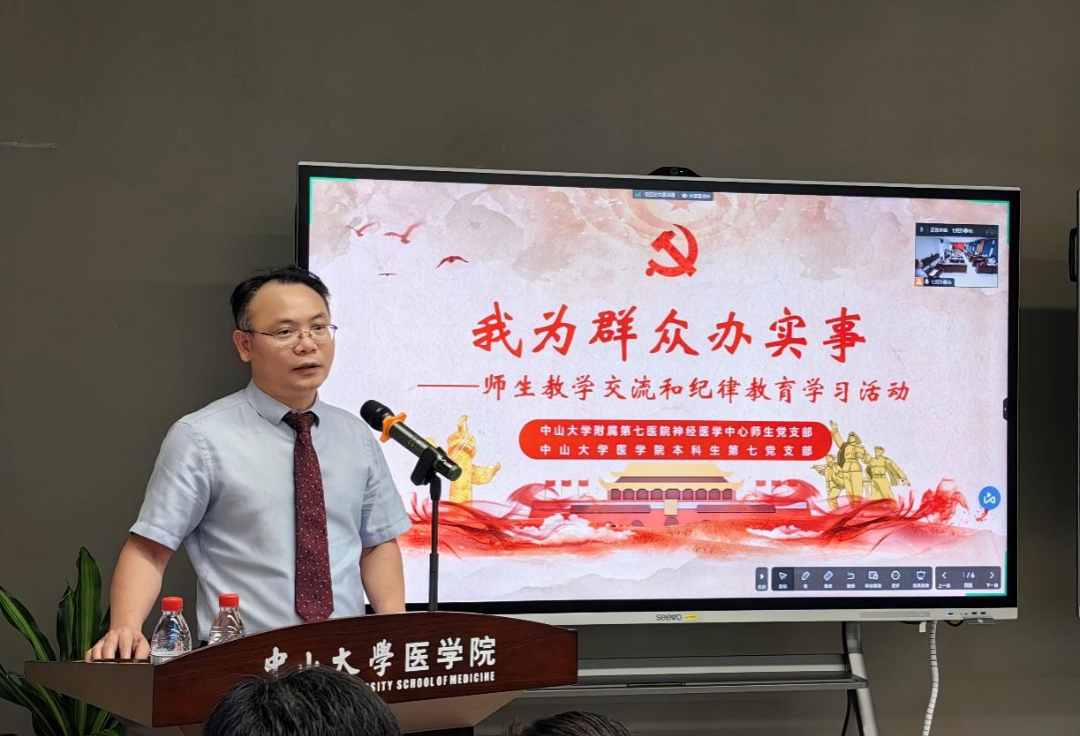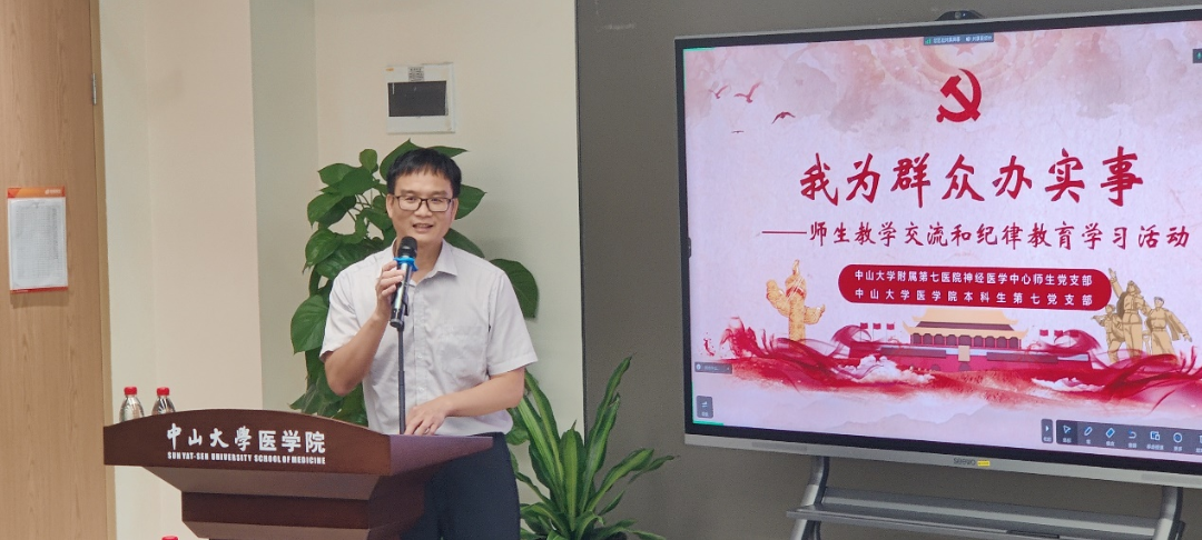 近日,神经医学中心师生党支部联合中山大学医学院本科生第七支部及2021级临床医学2班开展“我为群众办实事——师生教学交流和纪律教育学习活动”。我院党委陈起坤书记,教育处教学科副科长徐瑶瑶及研究生科田云婷副科长全程出席本次活动。