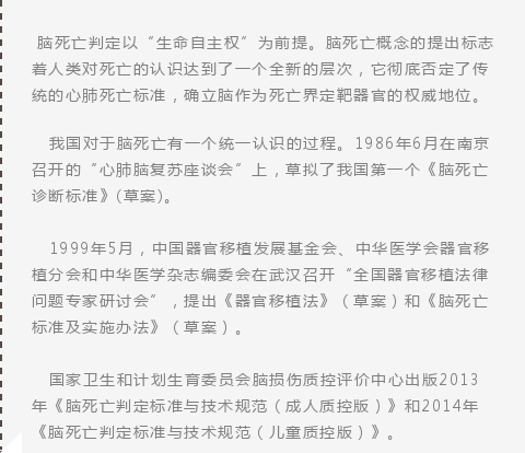 脑死亡定义的引入,使我国死亡的定义与国际社会接轨,也为公民身后器官捐献实践提供了客观的医学依据。
