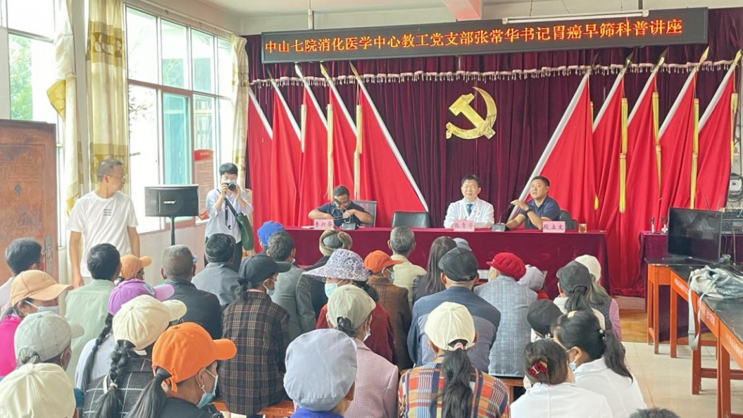 8月24日清晨7点,双方党支部联合医院不同科室医疗专家共同前往干马村进行义诊。抵达干马村后,消化医学中心教工党支部书记张常华教授率先为村民们开展了一次健康科普。张常华同志的科普内容紧贴村民的日常生活,譬如从“看大便颜色”,“戒烟、少吃腌制食品”等生活细节,引导村民关注自身健康。他还特别强调,“发现一例早癌,能拯救3代人”。通过此次深入浅出的科普活动,干马村村民表示对自身健康和科学保健有了新的认识。