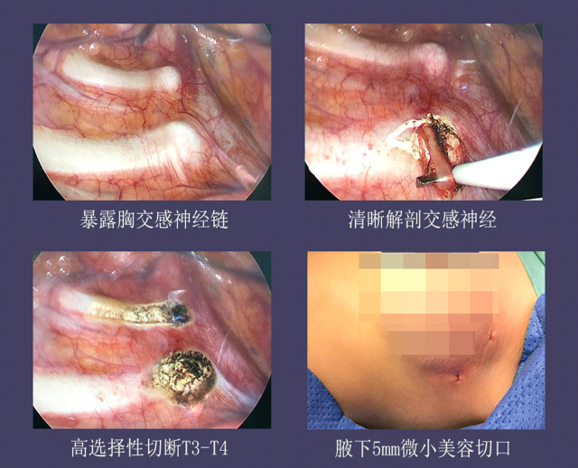 “微创胸腔镜下双侧交感神经链切断术”经过长期的改进,目前已成为外科治疗手汗症的标准术式。该手术治疗手汗症的机制主要是通过切断胸交感神经链,阻断其发出的支配上肢皮肤汗腺的节后纤维,从而达到治疗双手/脚多汗的目的。