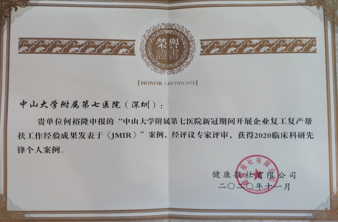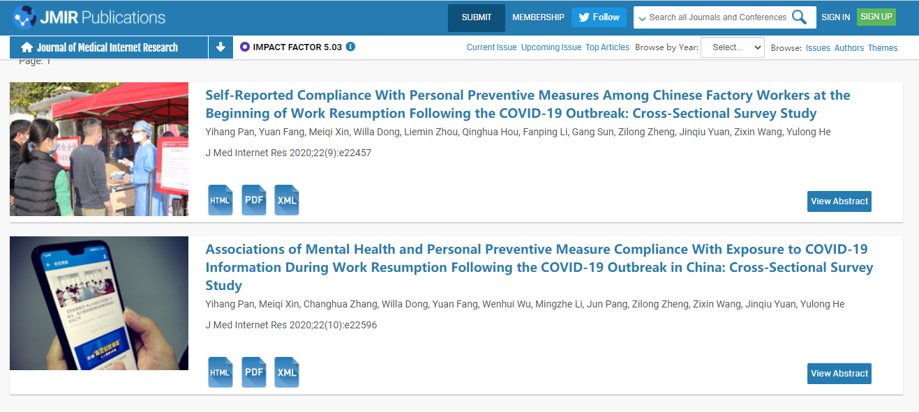 该案例针对新冠防疫措施,充分总结了深圳地区平稳复工复产的先进经验,从政府、媒体、企业、个人等多个层次提供了珍贵证据支持,具有重要实践意义,为我国其它地区乃至全球提供了参考证据。鉴于本调查的重要价值,研究成果近期以系列论文(2篇)的形式发表于医学信息领域TOP期刊Journal of Medical Internet Research(Rank 2/27, IF: 5.03),杂志社在期刊主页进行了专门报道。