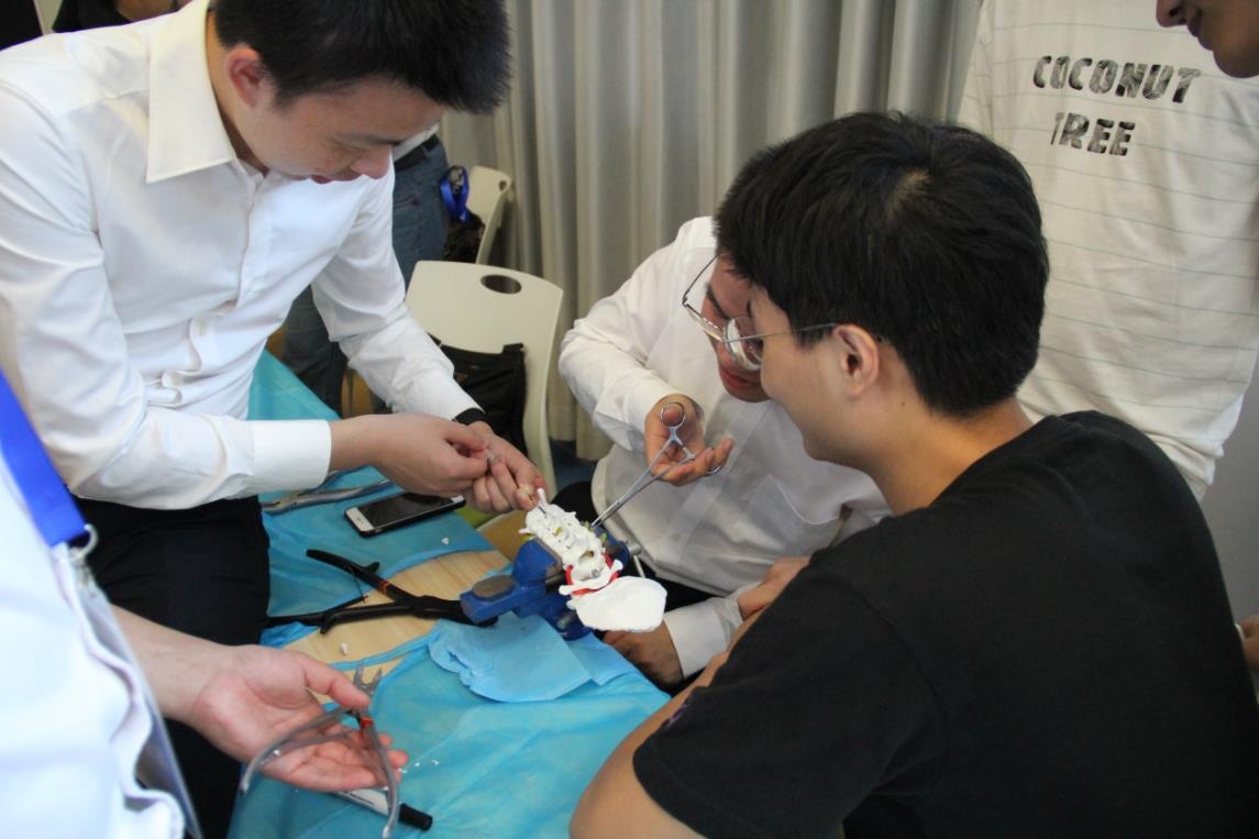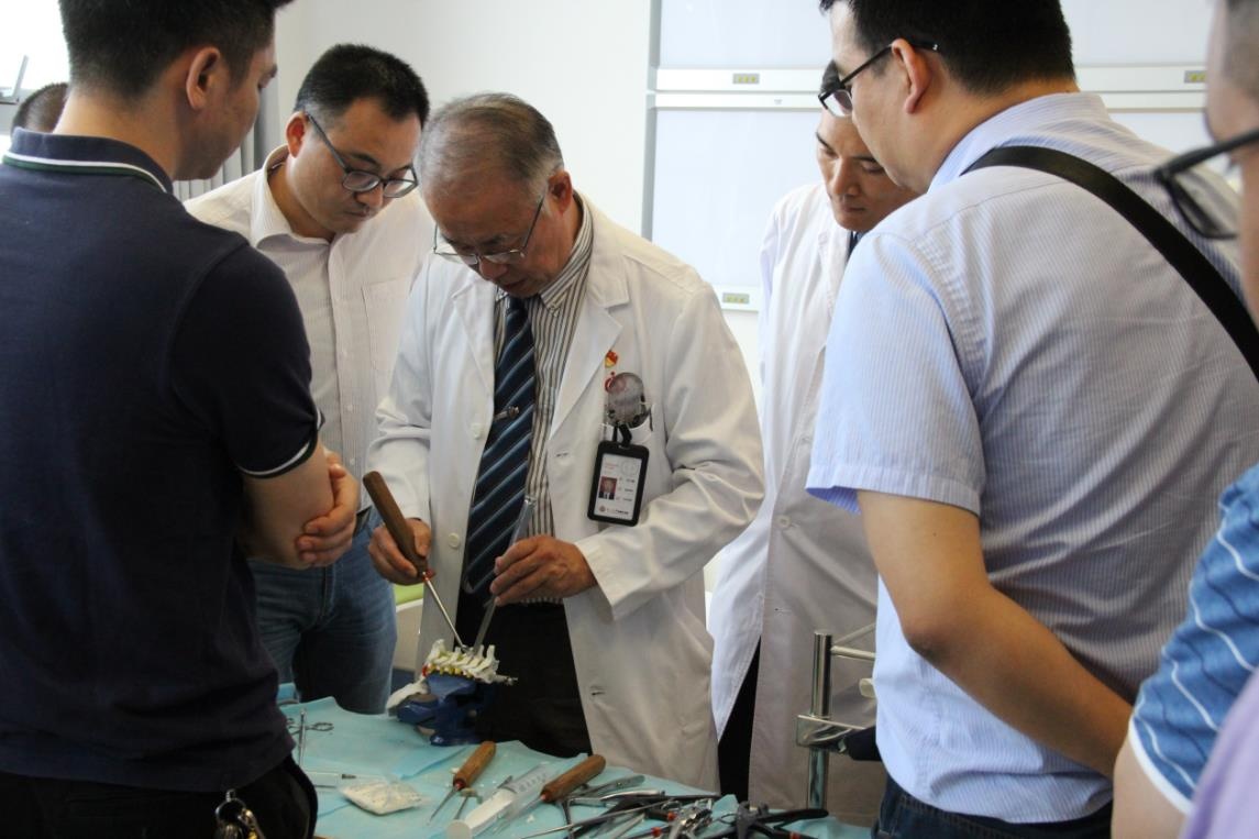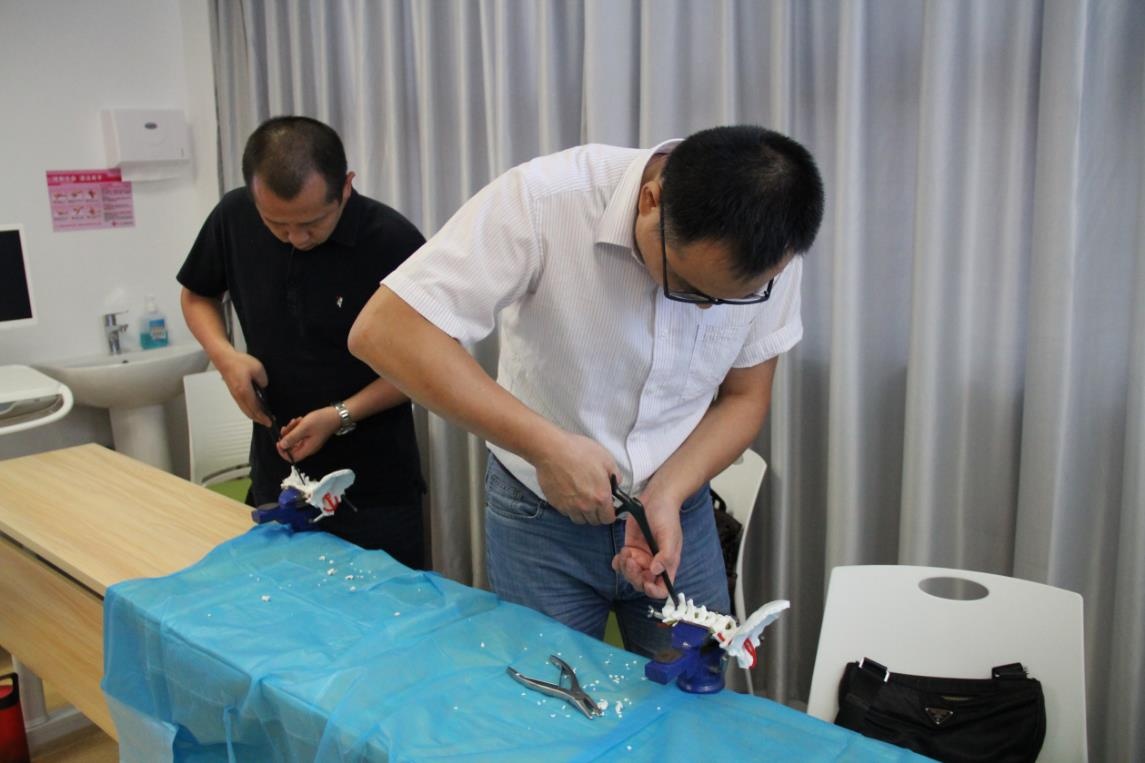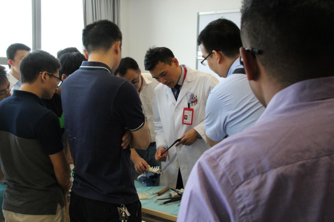 此次workshop结合手术器械与仿真模型,以及刘少喻主任团队自主设计研发的双开门门轴的尖嘴咬骨钳、椎板间撑开器等,真实地模拟了实际手术场景。刘少喻主任详细阐述了手术的适应症及禁忌症、手术节段选择等,结合术中手术视频,系统讲解了手术流程、手术重点及难点,并在颈椎模型上示范操作要领,分享了自身多年的颈椎后路双开门椎板扩大成形术的经验,充分展示了我院骨科在颈椎疾病治疗的特色与优势。魏富鑫副主任与学员深入交流,手把手纠正学员在操作中不规范的地方。日本留学归来的刘希哲博士后与在场学员分享了这一术式在日本的起源、发展及现状,同时深入分析了国内与日本的手术操作差异,总结了各自的优缺点。