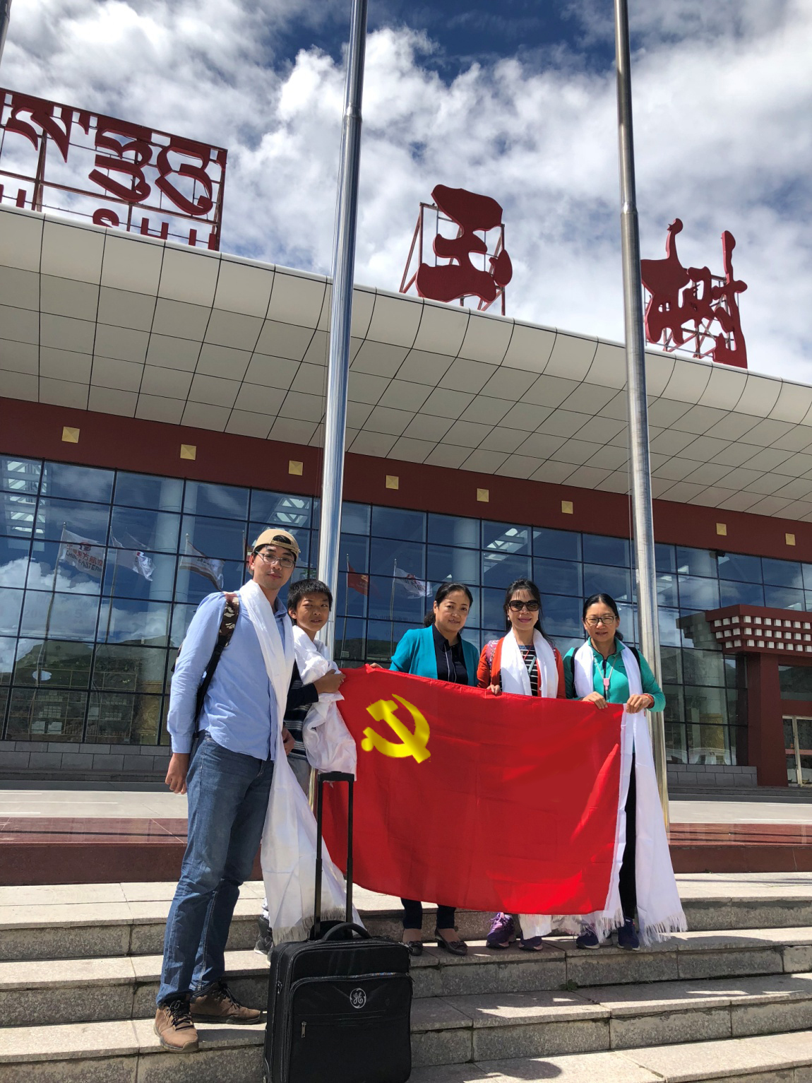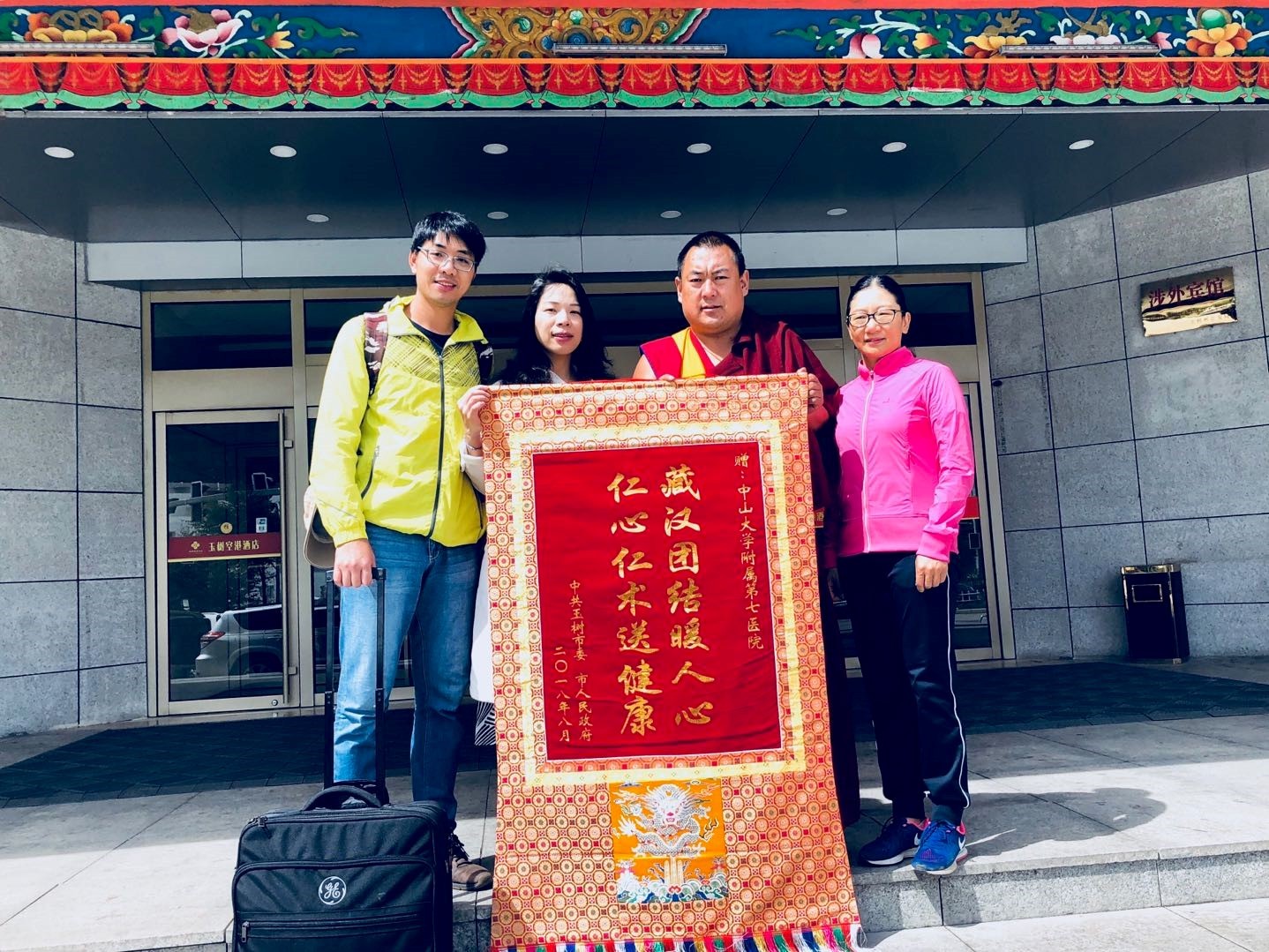 8月6日,医疗组成员飞抵玉树,玉树市副市长才玉来到机场欢迎,将洁白的哈达献给来自中山七院的朋友们。
