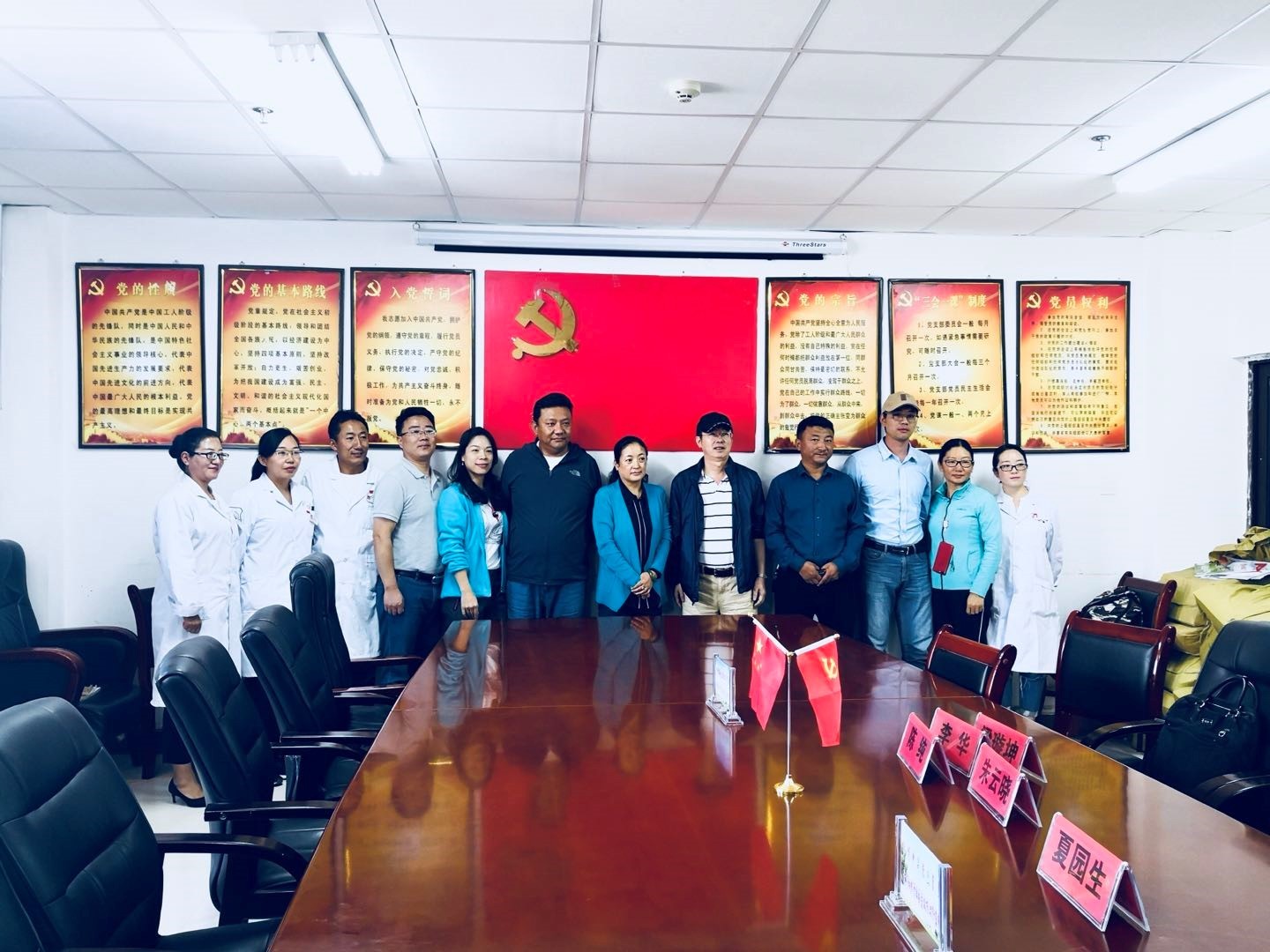 玉树市副市长(右六)、卫计局局长(右七)、玉树州八一医院数位院领导、科室主任与医疗组五位专家商谈