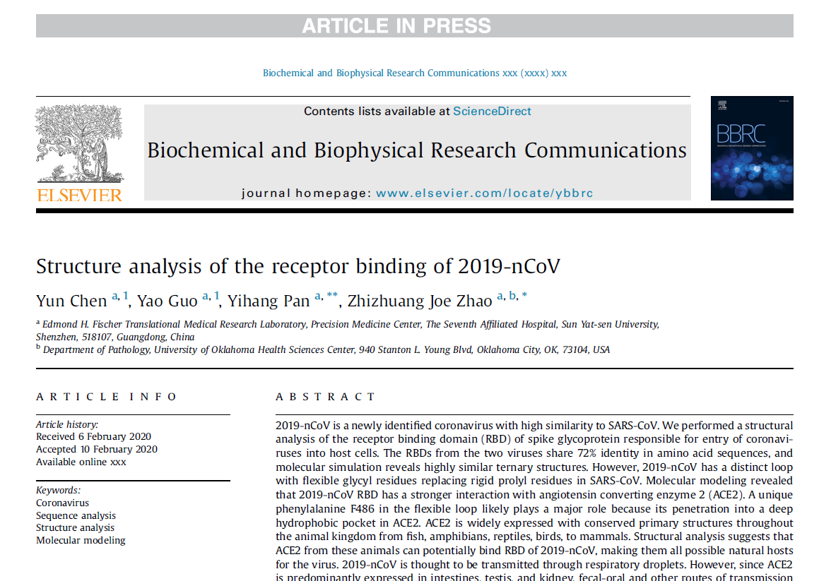 其中,我院精准医学研究中心陈韵副研究员、潘逸航副院长研究团队与赵志壮研究员科研团队展开合作,在国际期刊 Biochemical And Biophysical Research Communications 发表最新科研论文 Structure Analysis of The Receptor Binding of 2019-nCov ,为疫情预防和传播途径提供科学证据。据悉,此论文为中山大学首篇独立完成的新冠领域高水平论文。