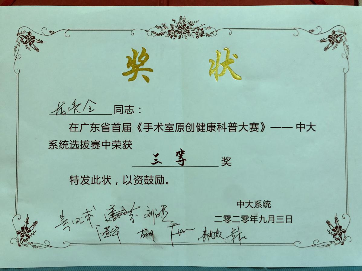 我院手术麻醉中心荣获中山大学“手术室原创健康科普大赛”三等奖