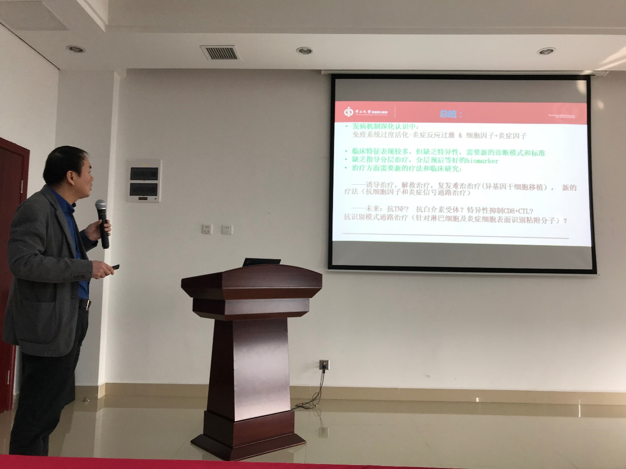 朱浩图主治医师首先就噬血细胞综合征(HLH)的定义、病因、分类、发病机制、病理生理、诊断标准、预后、治疗做了详细阐述,并就中国及欧美专家共识作了详细介绍及比较。病理科薛玲主任就HLH的病理特点进行了点评,儿科陈纯主任和薛红漫教授分享了儿童HLH的特点、诊断和治疗经验。