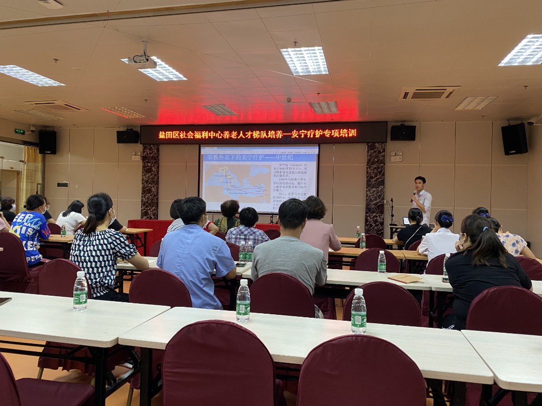 2020年9月2日,受深圳市盐田区民政局、深圳市健康养老学院的邀请,我院安宁疗护团队前往盐田区社会福利院对其百余名工作人员进行安宁疗护专项培训,参与此次安宁疗护专项培训的有张全亮教授、梁旭竞副主任医师、李志铃医师、党委办公室医学人文部方婵、杨慧琼和杨凯翎两位安宁疗护专科护士。此次培训旨在将安宁疗护的相关标准推广至社区,打造“医院-社区-家庭”三位一体的安宁疗护新模式,让安宁疗护惠及更多有需要的居民,吹响中山七院的安宁疗护品牌号角!