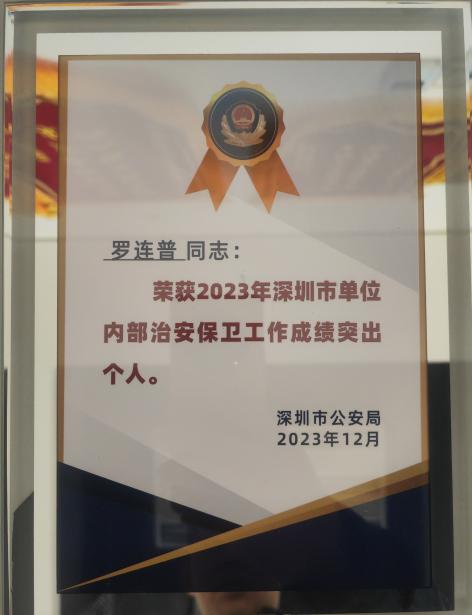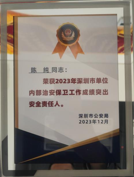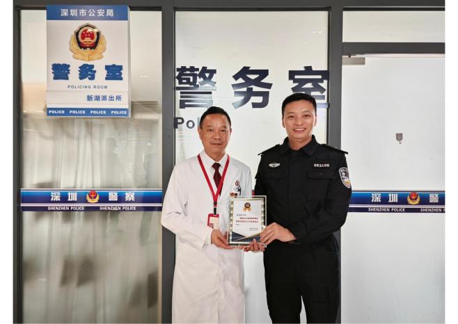 近日,刘遵映警长代表深圳市公安局向我院授予“2023年深圳市单位内部治安保卫工作成绩突出集体”荣誉奖牌,同时为副院长陈纯、保卫科副科长罗连普分别颁发“2023年深圳市单位内部治安保卫工作成绩突出安全责任人”和“2023年深圳市单位内部治安保卫工作成绩突出个人”荣誉证书。