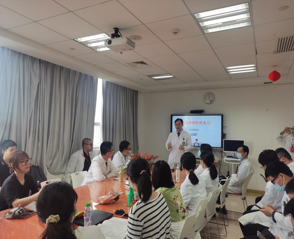汤主任根据医院外科实习教学大纲,分别对实习目的、实习时间分配、实习内容和要求(包括病房和门急诊)以及针对实习生的专项技术培训课程体系做了详细的介绍。汤主任强调在外科实习中,师生要传承“医病医身医心,救人救国救世”的中大医科精神,在实施常规教学培训同时,重视“医乃仁术”人文精神的培养,提升沟通交流能力、专业表达能力和解决实际问题的能力,并对新增加的外科腹腔镜和内镜微创技术培训、ERAS的理念与实施、基础护理技能等培训内容也做了一一说明。最后,汤主任对外科实习同学们提出具体要求,即全面参与病人的诊疗,全程以实习为中心严格要求、全方位提高综合素质,并预祝同学们可以在实习的过程中见到更多的外科病例,学到更多的临床知识和技能,为以后成长为“名医”打好基础。