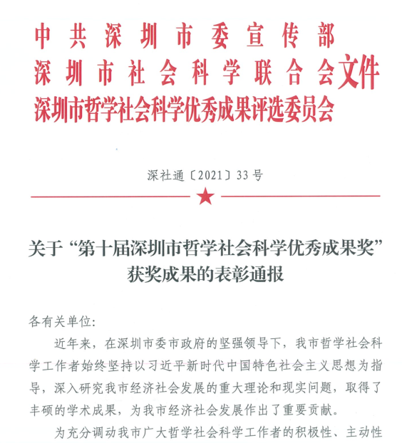 据悉,本次评选活动由中共深圳市委宣传部、深圳市社会科学联合会联合主办,深圳市哲学社会科学优秀成果评选委员会负责具体实施。此次共有76项成果入选深圳市第十届哲学社会科学优秀成果奖,其中学术论文类35项,我院为深圳市唯一有成果入选的医疗卫生机构。