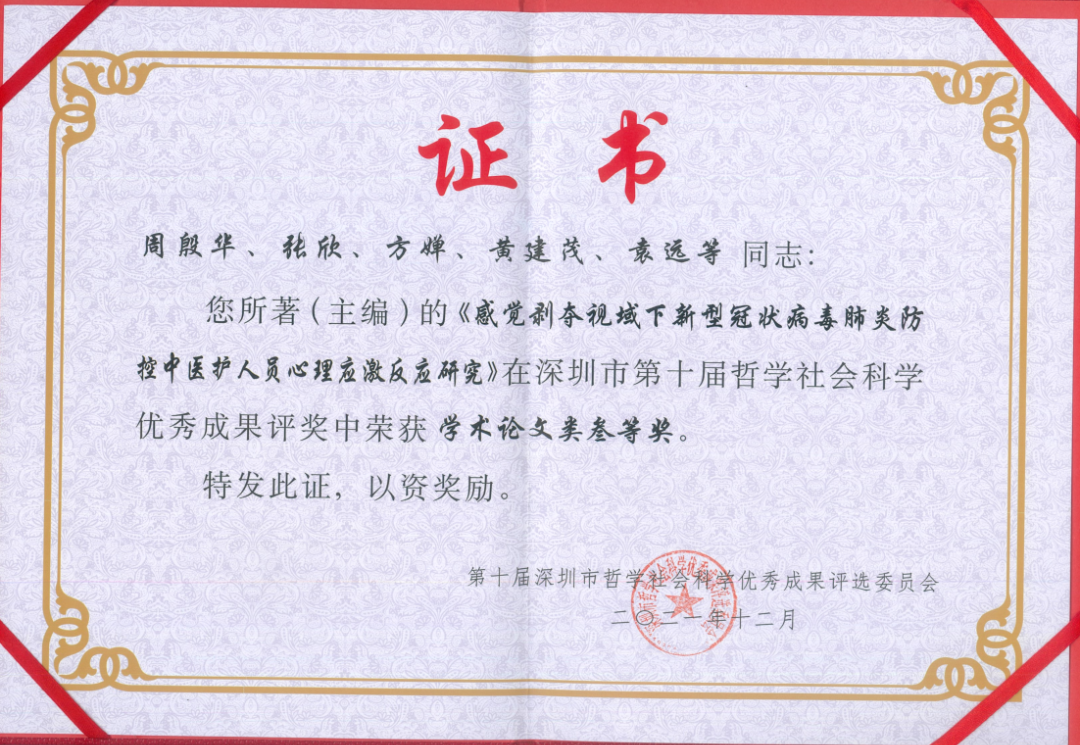 近日,第十届深圳市哲学社会科学优秀成果奖评选结果正式揭晓,我院医学人文团队发表论文《感觉剥夺视域下新型冠状病毒肺炎防控中医护人员心理应激反应研究》荣获学术论文类三等奖。