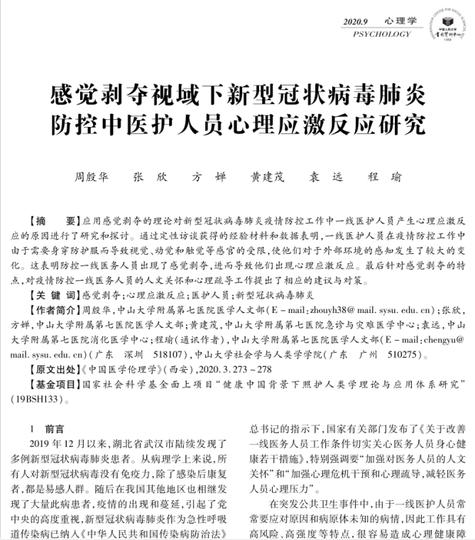 该论文发表于《中国医学伦理学》2020年第3期,被中国人民大学书报资料中心复印报刊资料(人大复印资料)《心理学》2020年第9期全文转载。文章第一作者为医学人文部周殷华副研究员,通讯作者为我院医学人文教研室程瑜教授。该文应用感觉剥夺的理论对新型冠状病毒感染肺炎疫情防控工作中一线医护人员产生心理应激反应的原因进行了研究和探讨,并对疫情防控一线医务人员的人文关怀和心理疏导工作提出了相应的建议与对策。该文是我院逐步推动医学人文医教研一体化发展的生动体现。在抗击新冠肺炎疫情期间,我院医学人文团队在党委领导下,积极落实抗疫一线医务人员心理支持相关工作,并进一步将实践成果进行科研转化,撰写、发表研究论文,将医学人文理论与实践紧密结合。