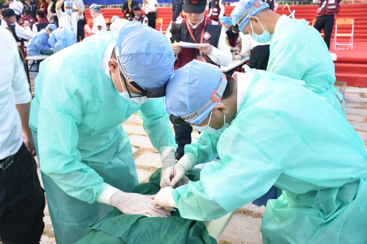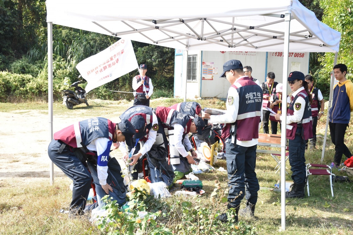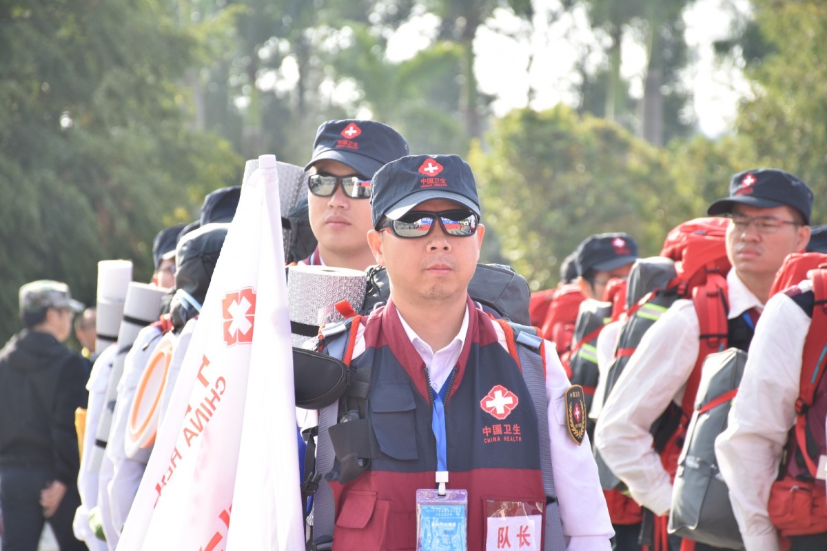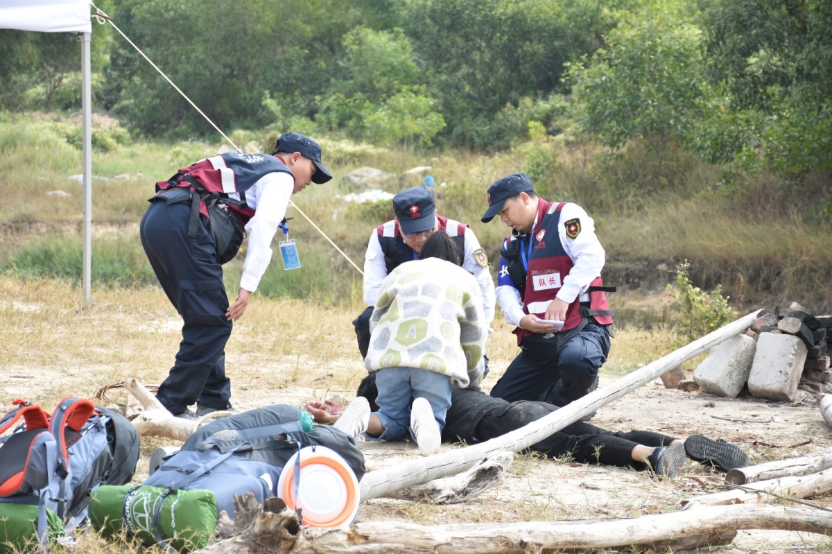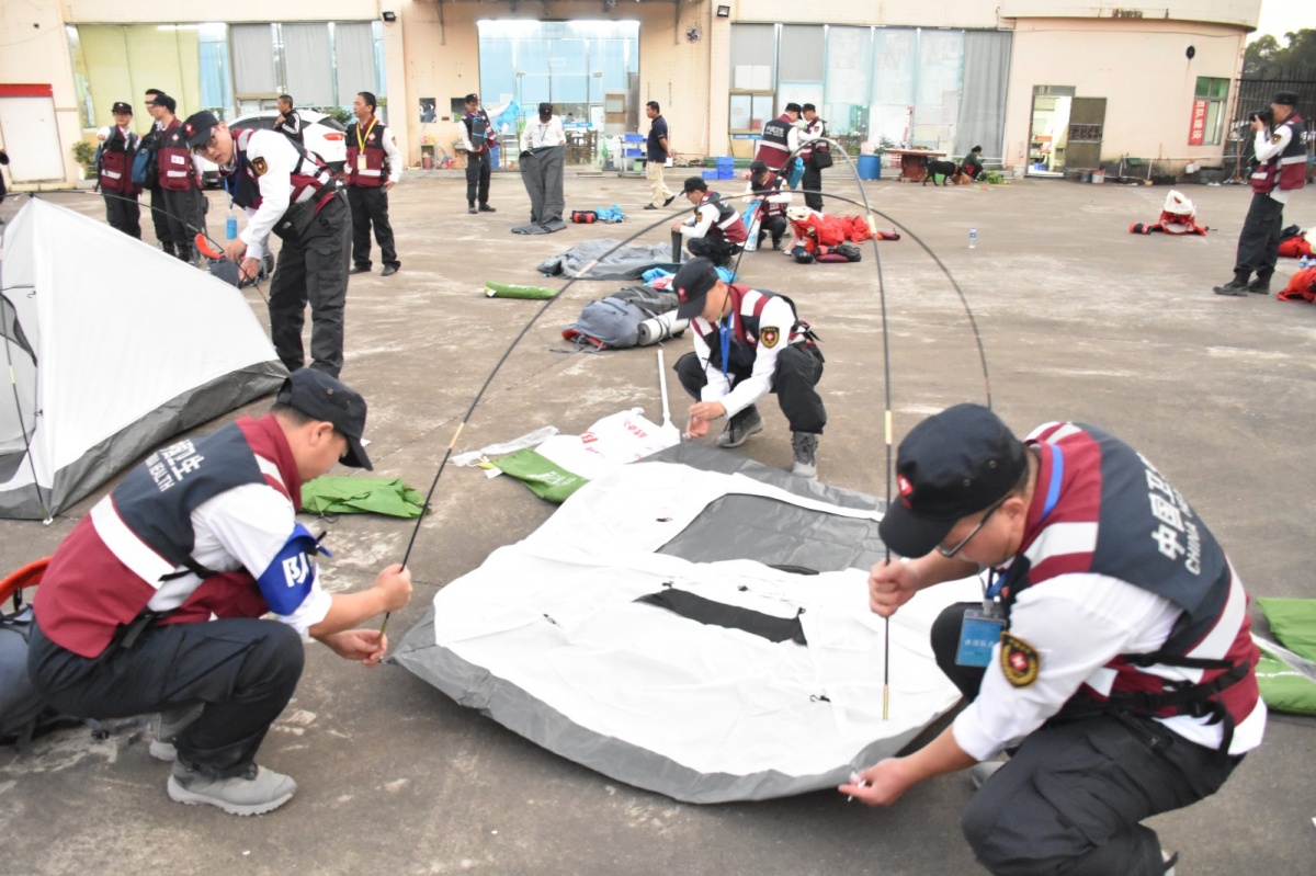 演练设在野外进行,各队5名队员携带个人携行装备(约30kg)徒步行进,全程约12公里。途中设立若干模拟情景点,分别考核参演队员的紧急医学救援基本技能、专业理论、野外生存能力、个人携行装备配置等4个部分9个考核情景。基本技能考核采用模拟灾害现场处置形式,主要考核灾害相关急症现场紧急处置技术:如心肺复苏(含成人、儿童、新生儿)、清创缝合、止血包扎、固定搬运、传染病现场处置、溺水救治、紧急手术、心理急救等。野外生存能力考核包括自我生活保障和营地建设。