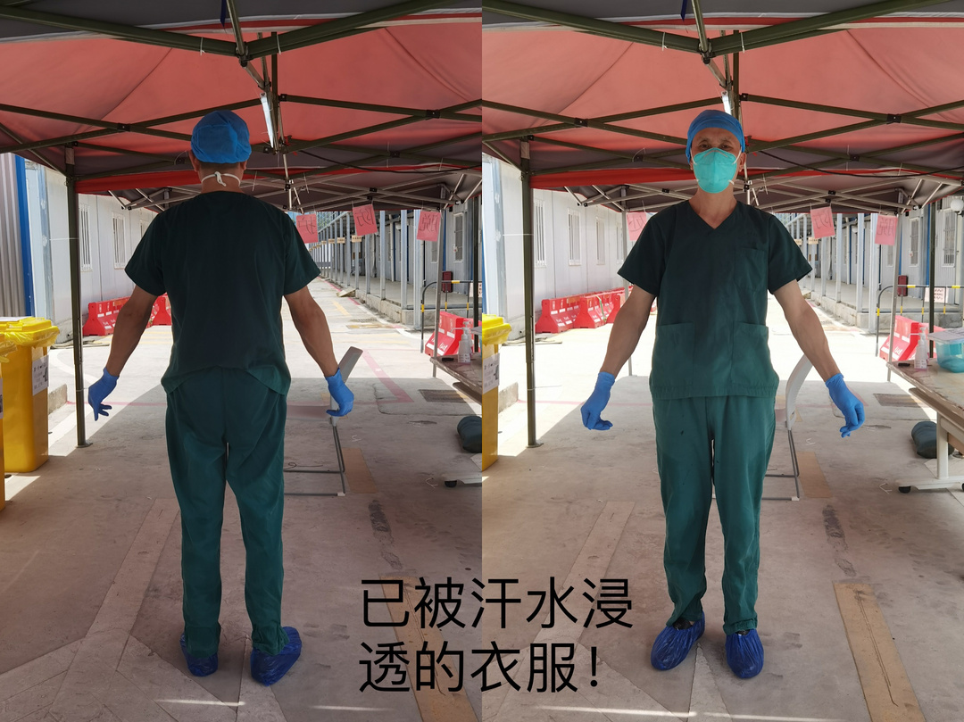 上图为护理人员正在给病区ICU 87岁脓毒血症患者进行基础护理操作。穿防护服干活不超4小时不难,难的是天天如此,难的是在室外温度平均35摄氏度的高温下爬楼梯,内穿衣湿了干,干了湿。但这里的医护人员始终以敬业的态度做好专业操作,以细致的耐心一份一份给病人发放餐食及生活必需品。