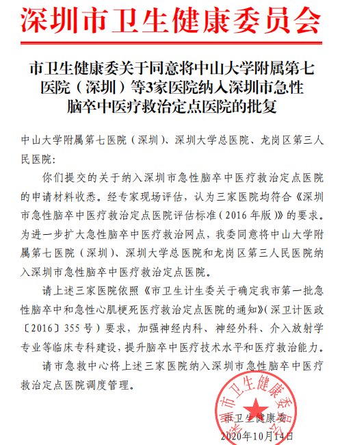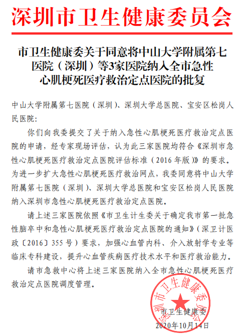 10月14日,深圳市卫健委批复将我院纳入深圳市急性脑卒中及急性心肌梗死医疗救治定点医院。