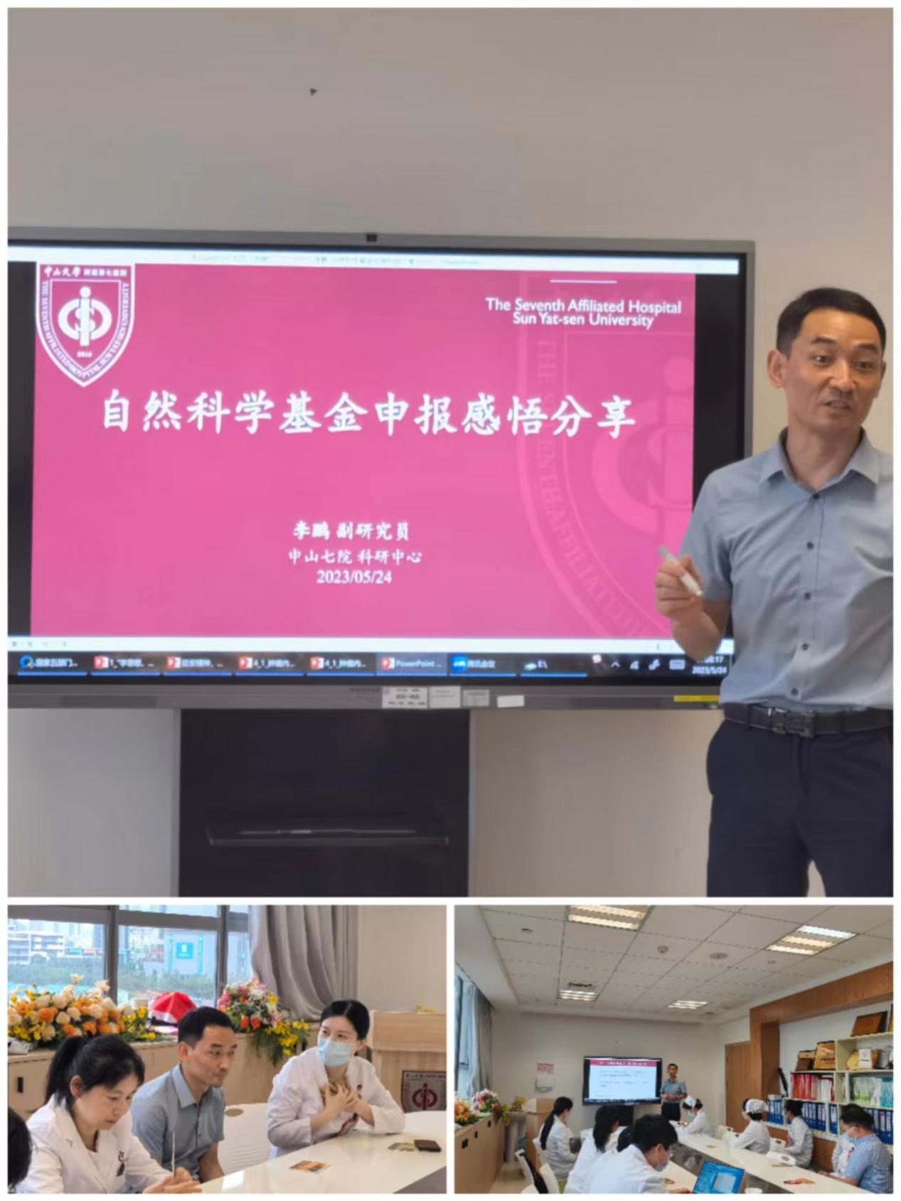 袁金秋副主任从临床研究定义、临床研究分类、临床课题基金来源(国自然,省、市单位课题,企业,协会、平台项目子课题)等方面进行临床课题申请分享,对自己成功获批的一份临床研究标书进行细致解析。他强调,项目的申请整体规划尤为重要,既要顺延前期的研究,在该领域需要有一定的文章积累,又要合理设计实验,预实验要充分,最重要的是认真准备。他还耐心地为同志们解答了在申请课题中存在的困惑及相关问题,也为医护技各层面课题的申请进行了指导、提供了方向。