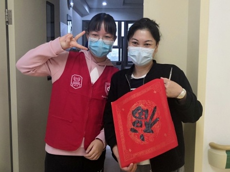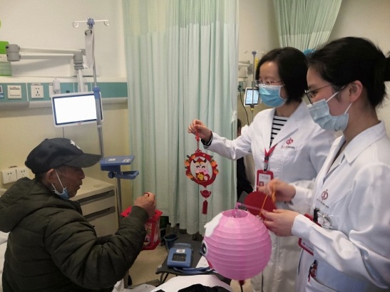 新春佳节期间,许多病情稳定的患者都选择出院回家,和亲人一起团聚过年,但仍有很多病情不稳定或需要治疗的患者,只能留在病房度过新春佳节。2月9日,医学人文部、医务社工和志愿者服务部和工会办公室到住院部为留院患者拜年,表达新春问候,并送上由医务人员亲手制作的新春挂饰。充满节日气息的“小牛”挂饰,凝聚着我院职工和志愿者最诚挚的祝福。一同前往新春探访的还有一位特殊的小志愿者,作为我院职工子女为临床科室和住院患者送上她自己写的“福”字,将美好的新春祝福传递到临床科室和患者心中,带去我院对患者和家属们的祝福和期望。