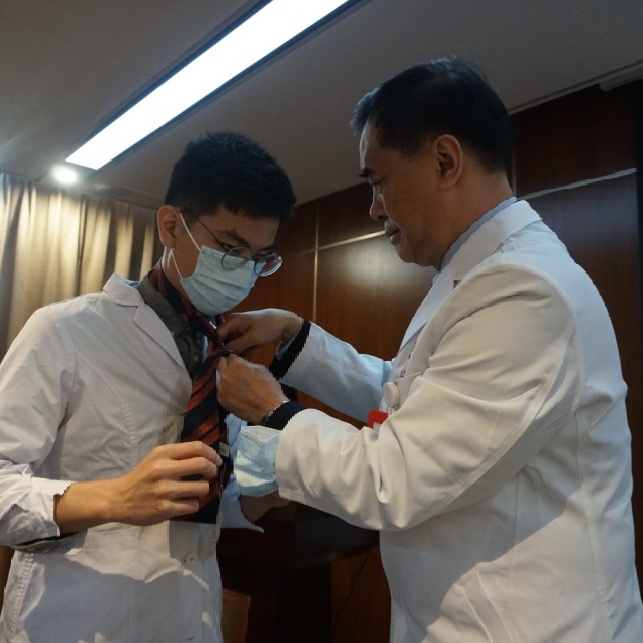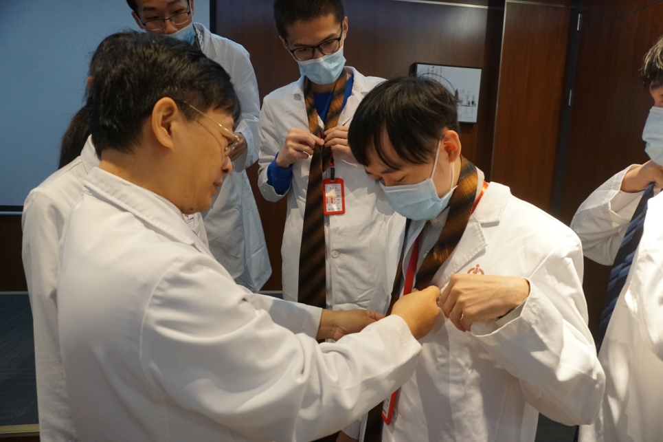 何裕隆院长强调“德不近佛者不以为医”,医学生是青年学子中的佼佼者,要有强烈的荣誉感和责任感。要想获得患者和家属的信任得从平时的小事做起,比如注意自己的穿着打扮,男生要穿衬衣、戴领带等,何院长现场给同学们示范了戴领带的详细步骤,让同学们感到无比的亲切。