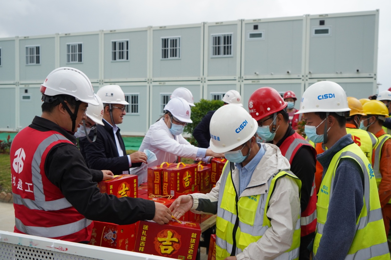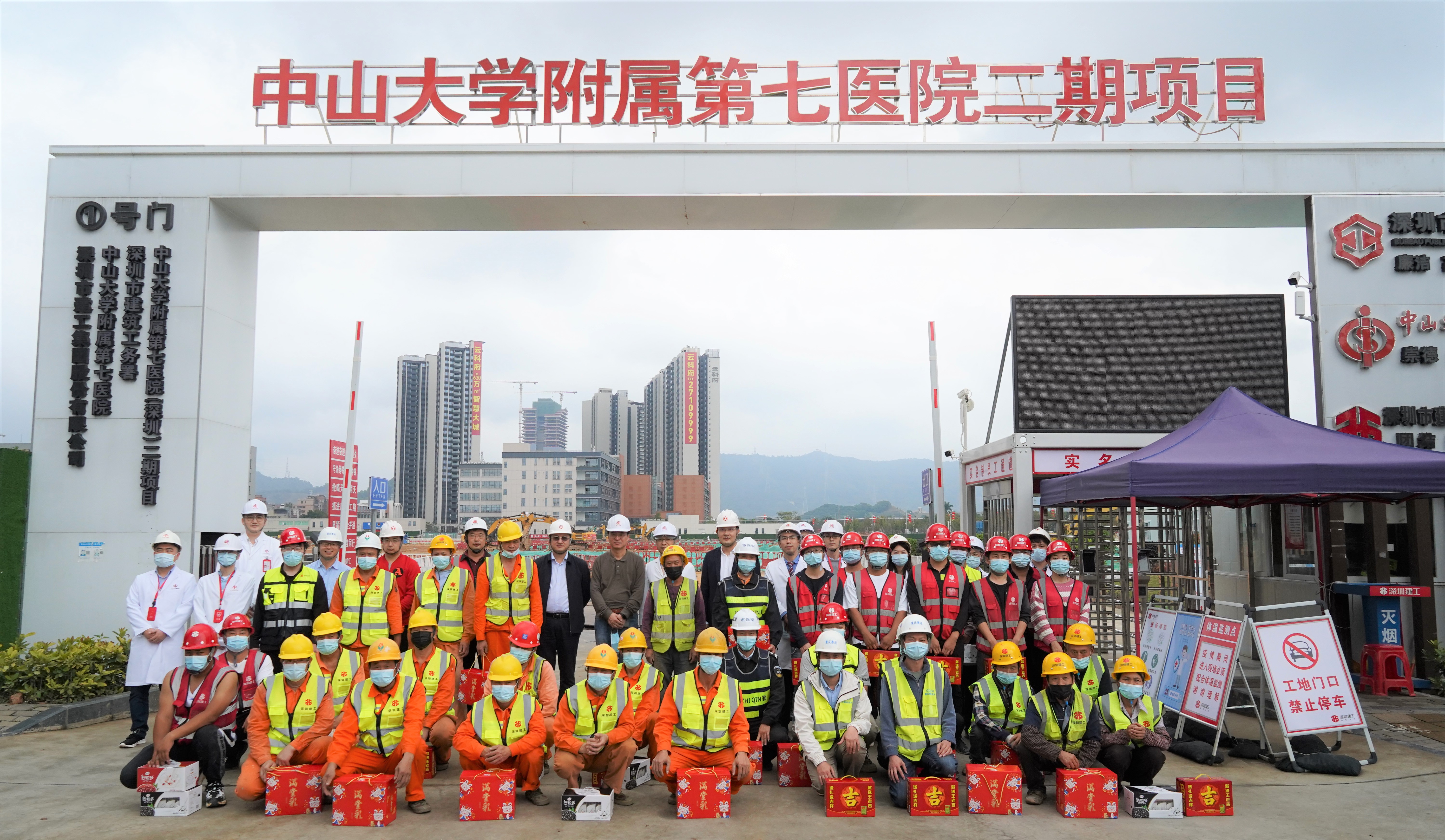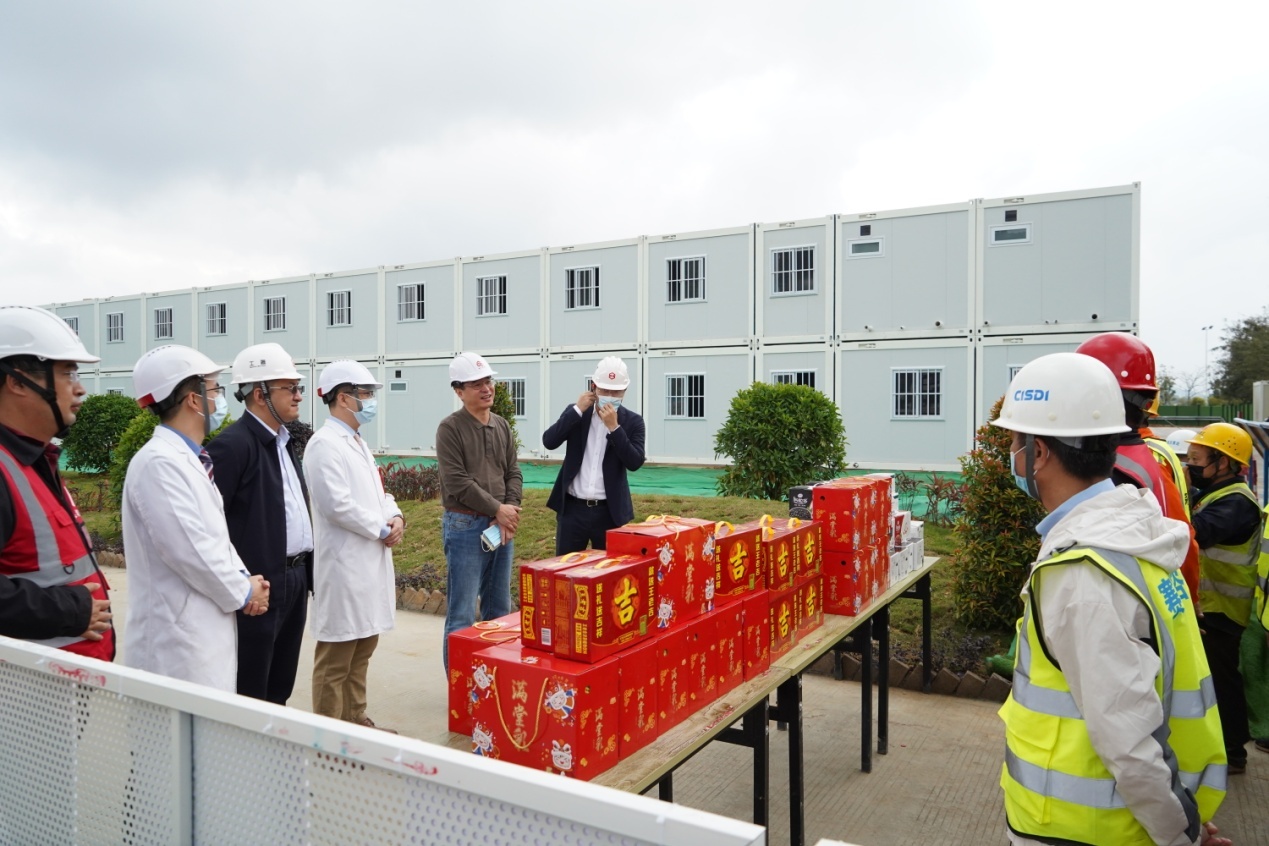 我院二期项目作为省市重大项目,其建设一直受到中山大学校领导的高度重视。2022年春节将至,1月24日,邰忠智副校长到我院二期项目现场进行春节慰问。在施工现场,邰忠智副校长向工友们表达了春节祝福和美好祝愿,关切询问了目前留守工地工友们的饮食、住宿情况,嘱托工友们在春节期间一定要做好个人防疫工作,节后能顺利返工;一定要一如既往地保持安全意识,做足安全措施,做到安全施工。邰忠智副校长同时强调不能拖欠工友们的工资,让工友们安心回家过个好年,并现场向工友们送上了防疫用品、年货及日用品等新春礼包。
