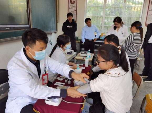 在巴别乡中心小学进行“送课送医下乡”暨爱心助残活动中,支医队长王朴副主任医师(田阳区人民医院挂职副院长)、消化内科邓茜医生、黄勇主管护师及康复医学科卞敏洁治疗师为巴别乡中心小学教师进行职业病检查。巴别乡远在大山深处,教师进出不易,教学任务重,饮食条件有限,肩颈疼痛、高血压、消化系统疾病等情况常见。教师是辛勤的“园丁”,为培育学生劳心劳力。在活动中,王朴队长带领队员耐心细致地为教师查体、健康宣教,力求将义诊服务带进乡村,改善教师的健康水平。义诊得到了当地教师的高度肯定,他们激动地表示,平时没时间也没有机会接触医疗专家们,现在终于有机会了。中山七院支医队立足本职岗位办实事、做好事,在活动中通过与当地教师及教育局干部的交流,支医队同事们纷纷表示自身的党性也得到升华。支医队将继续为边陲乡村百姓送健康。