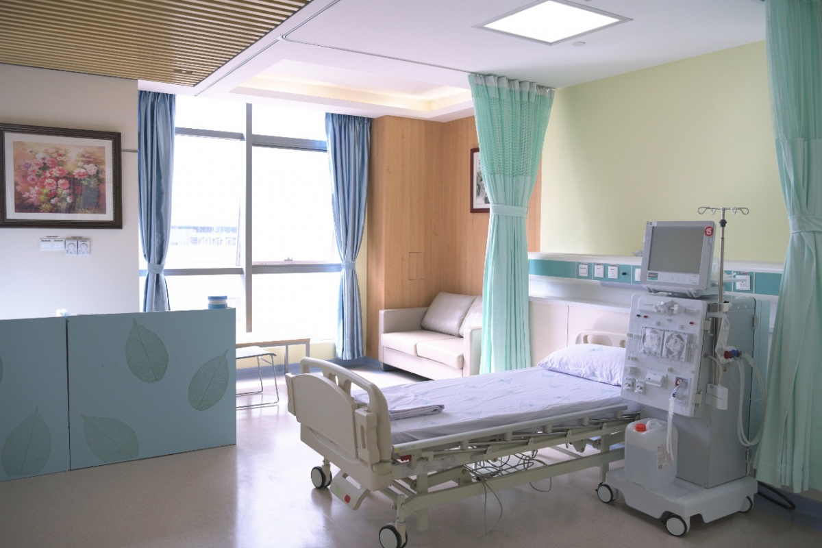 中心内部设计以暖色调为主,多采用玻璃隔离,保证采光和通透,墙上是医务人员精心装饰的图案。候诊区域设有沙发供病人等候,透析室还放置多个电视,让病人可以轻松度过透析时间。