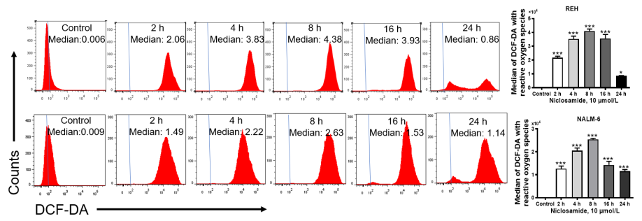 氯硝柳胺在2小时内引起细胞内ROS升高,8小时左右达峰,诱导ALL细胞氧化应激,导致细胞凋亡。