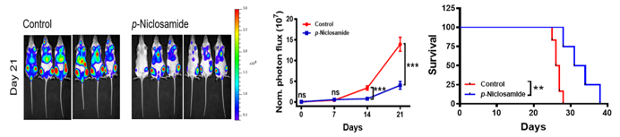 氯硝柳胺可显著抑制NALM-6细胞在NCG小鼠体内的生长,明显延缓了ALL疾病进程,可显著延长 ALL 小鼠生存期。