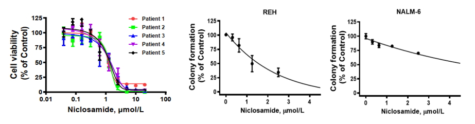 该研究证明氯硝柳胺具有较强的拮抗急性淋巴细胞白血病的作用,明显延缓了疾病的进程。此外,该研究还发现,氯硝柳胺可以抑制体内和体外急性淋巴细胞白血病细胞生长、增殖,延长急性淋巴细胞白血病(ALL)小鼠的生存时间,为临床上初发或复发急性淋巴细胞白血病的治疗提供了一种新的高效低毒的策略参考。