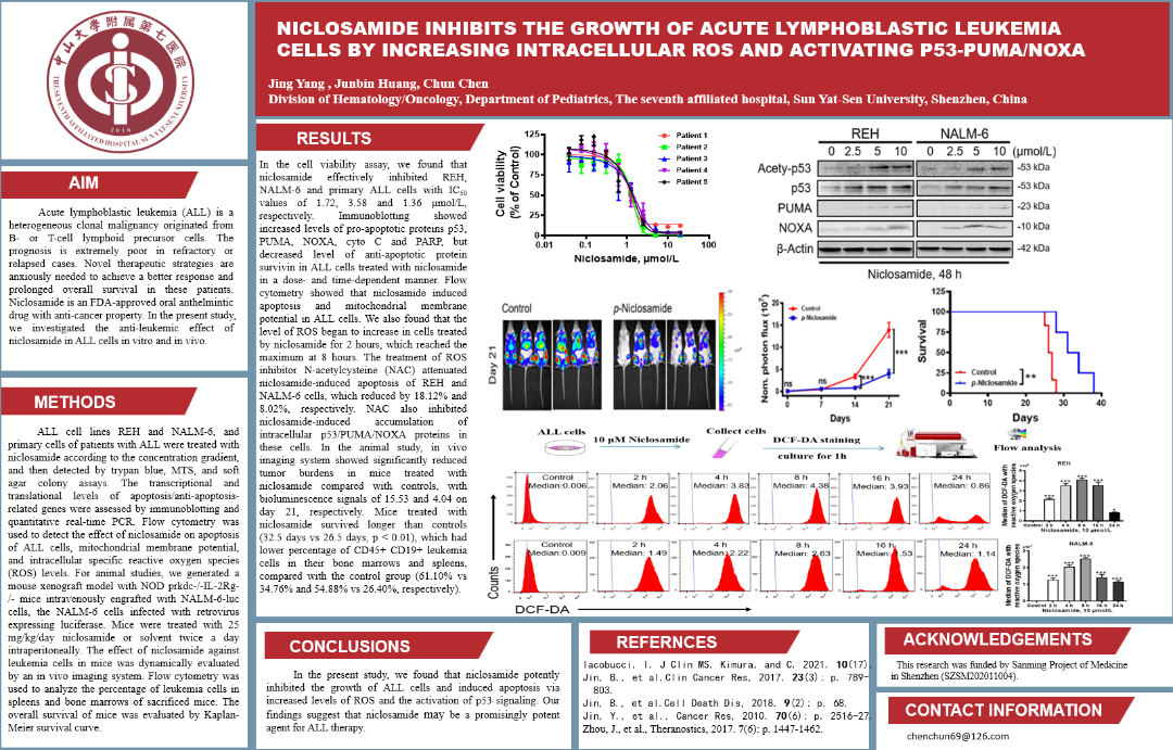 第64届美国血液学会(ASH)年会于2022年12月10-13日召开。中山七院儿童医学中心“三名工程”团队李志光教授儿童血液肿瘤团队与中山眼科中心合作开展的"Niclosamide inhibits the growth of acute lymphoblastic leukemia cells by increasing intracellular ROS and activating p53-PUMA/NOXA"研究结果入选2022 ASH Poster。其中,中山大学附属第七医院儿童医学中心杨静博士为第一作者,陈纯教授为共同通讯作者。