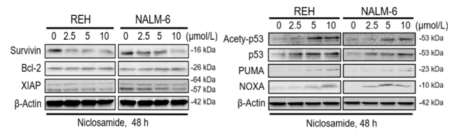 Western blot结果表明:氯硝柳胺显著下调抗凋亡蛋白Survivin的水平(时间和剂量依赖),而对Bcl-2和XIAP的表达影响不明显;氯硝柳胺诱导ALL细胞内p53蛋白第382位赖氨酸乙酰化激活,导致转录因子p53、促凋亡因子PUMA及NOXA在ALL细胞中积累,从而诱导白血病细胞凋亡。