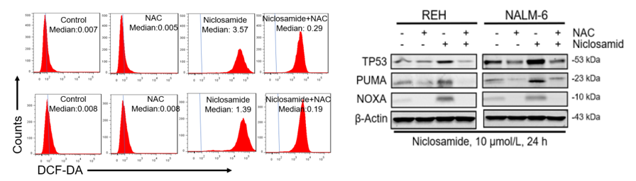 N-乙酰半胱氨酸逆转了氯硝柳胺介导的ROS升高,逆转了氯硝柳胺介导的p53、PUMA及NOXA在细胞中的积累。