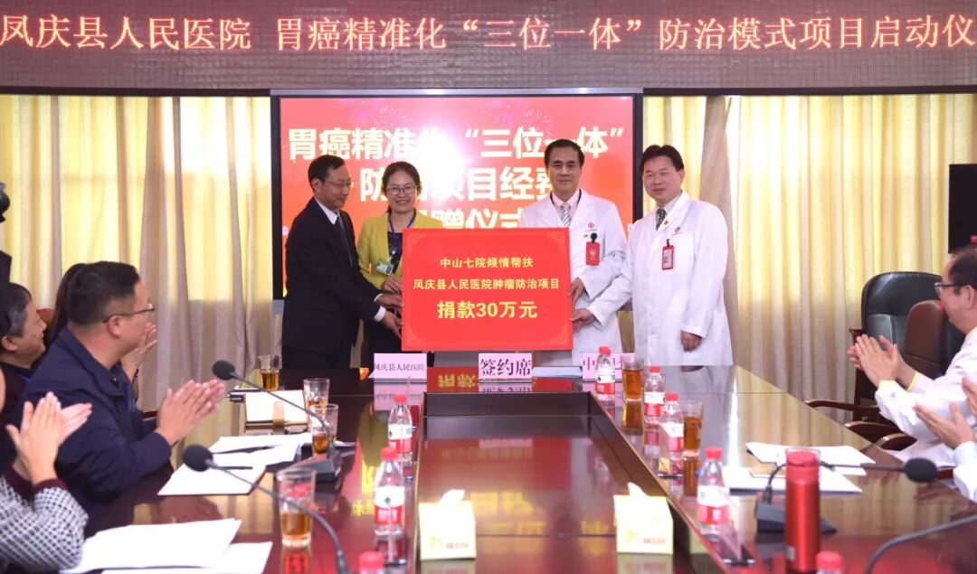 2013年,中山大学启动定点扶贫云南省凤庆县工作,并从2014年3月起派出医疗团队开展医疗帮扶。2017年11月,中山七院还未开业,就接到任务到凤庆进行帮扶。何裕隆教授作为中山七院院长亲自带队。这次帮扶,中山七院医疗队务实的扶贫作风和精湛的诊疗技术得到了全县上下的高度认可。2018年8月11日,中山七院与凤庆县人民医院正式签订对口医疗帮扶协议,并选派张常华教授为凤庆县人民医院挂职院长,希望通过3年的全方位、持续性对口帮扶,把凤庆县人民医院建成县域医疗中心。