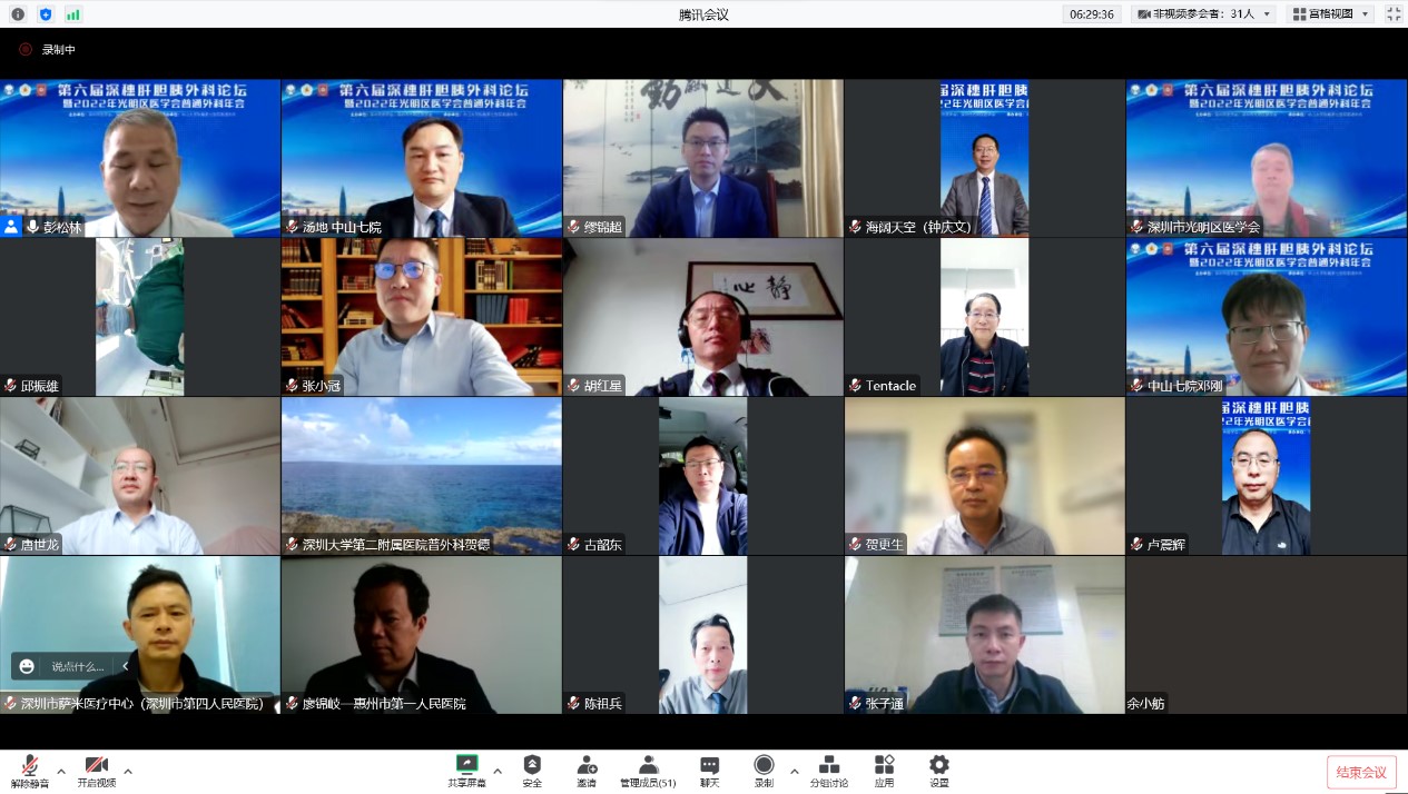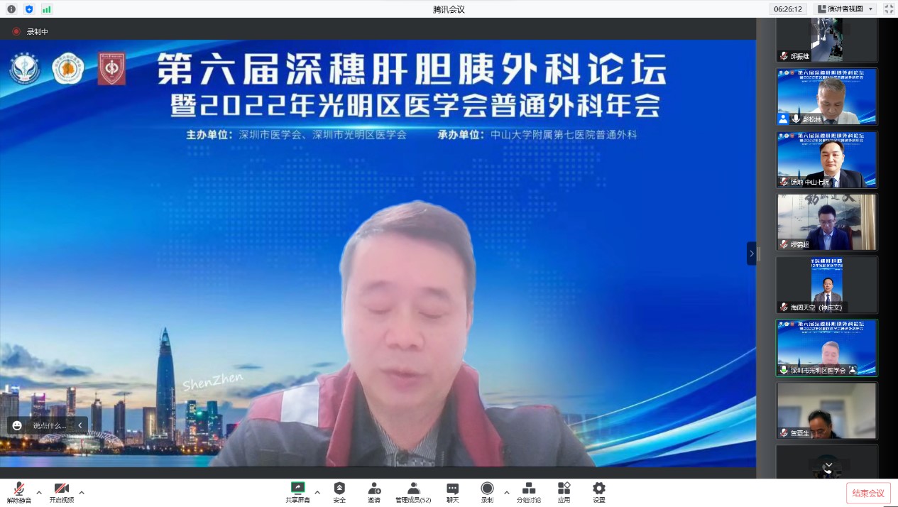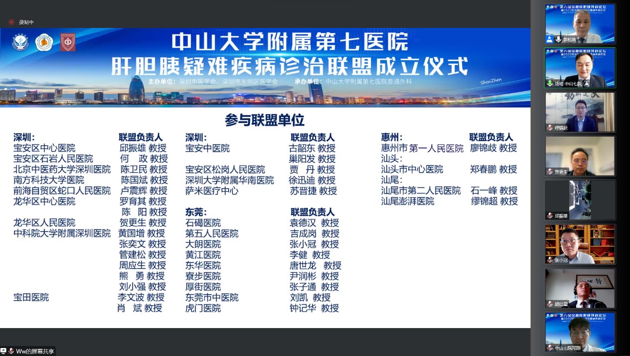 下午1:20中山七院钟庆文院长助理宣布“中山大学附属第七医院肝胆胰疑难疾病诊治联盟”成立并致辞,他表示,我院肝胆胰疑难疾病诊治联盟作为“松散型、跨区域、互利共赢”的专科联盟,它的成立响应了“健康中国2030”规划纲要的要求,势必为广大人民群众提供优质的医疗服务,形成上下联动、优势互补、资源共享的运行机制,将极大的提高区域医疗诊治水平。汤地主任宣读了联盟单位和各单位负责人名单。本次联盟共召集了深莞惠汕等5个城市,共28家医院肝胆(普外)专科及34位负责人,力求实现各联盟单位临床共享、科研共享、教学共享。光明区医学会胡建辉秘书长肯定了联盟的工作,他表示诊治联盟的成立,将为粤港澳大湾区、深汕合作区以及光明区的卫生事业发展注入新的活力,产生巨大的影响。中山七院邓刚医师对联盟的筹备过程、联盟的工作机制以及未来的工作展望进行了详细的介绍。各联盟单位积极响应,在线上进行联盟成立仪式并合影留念。